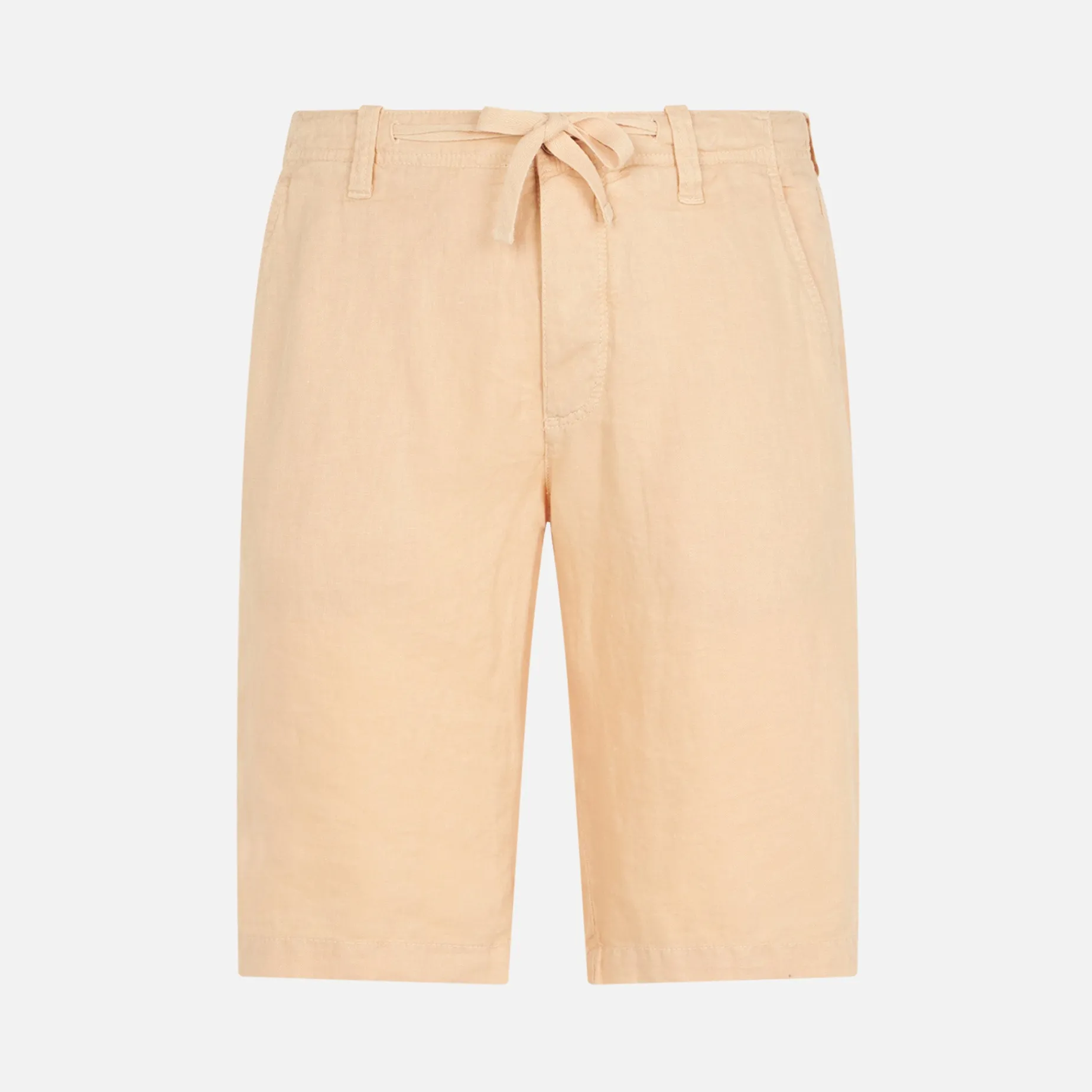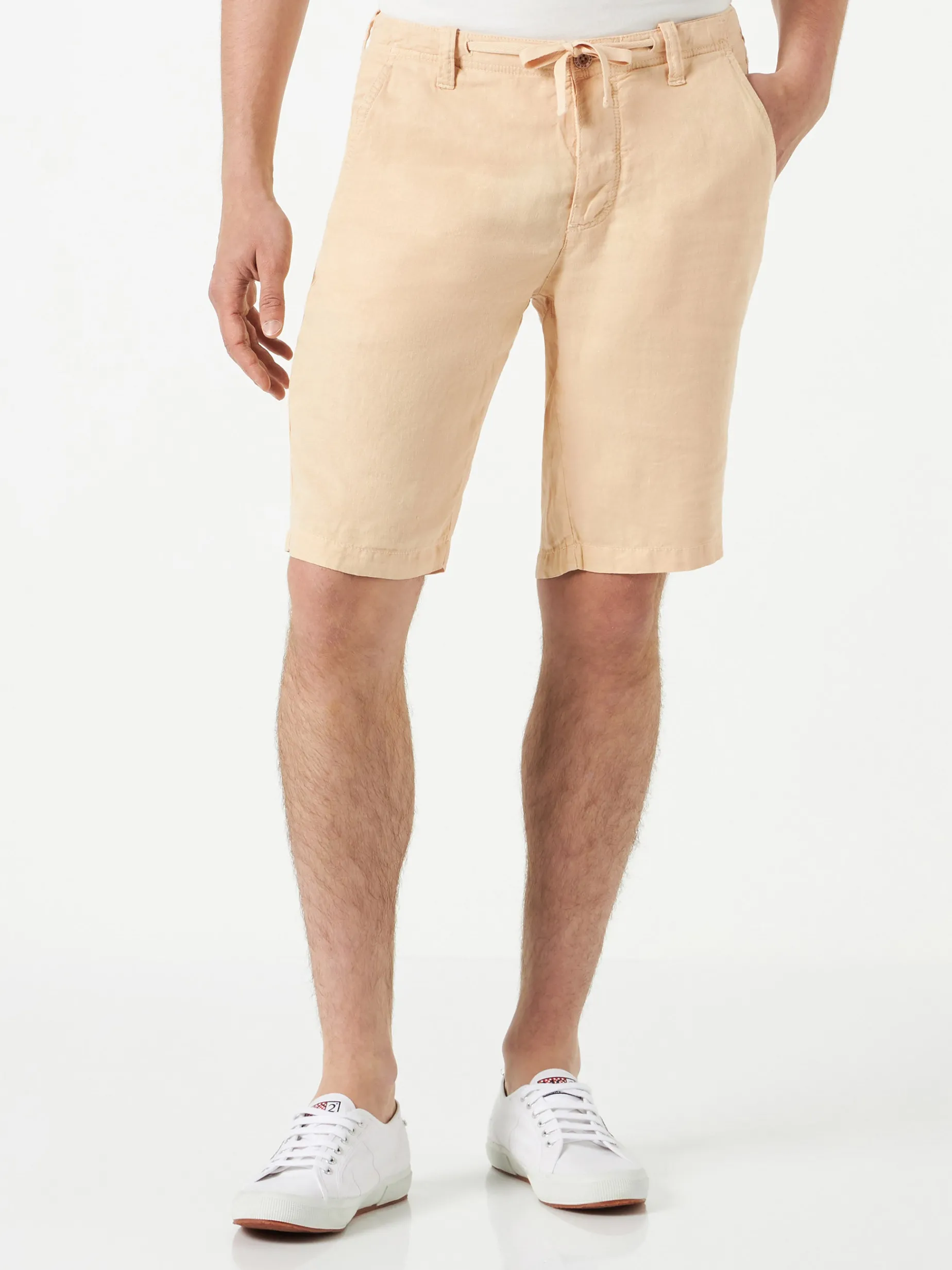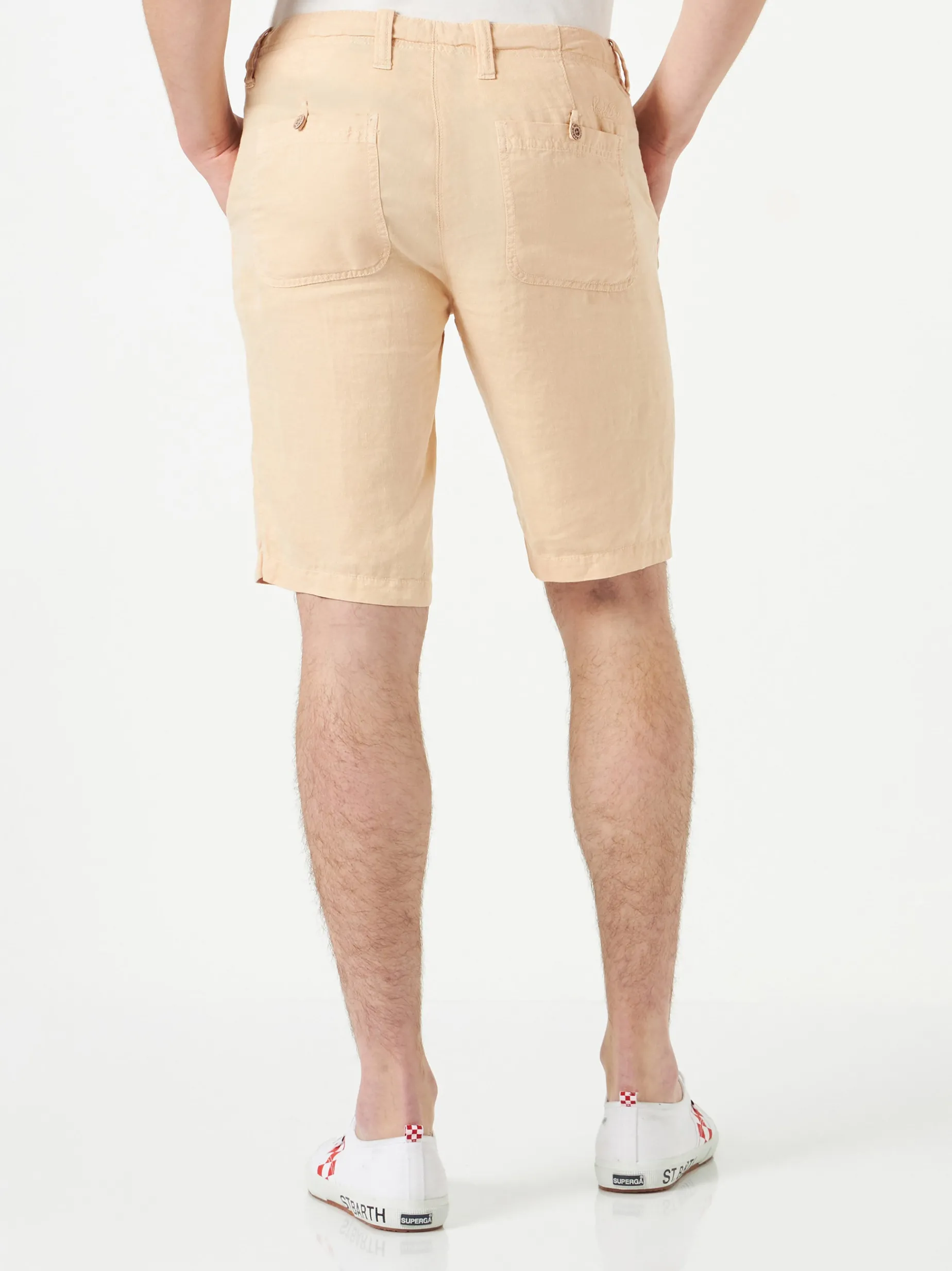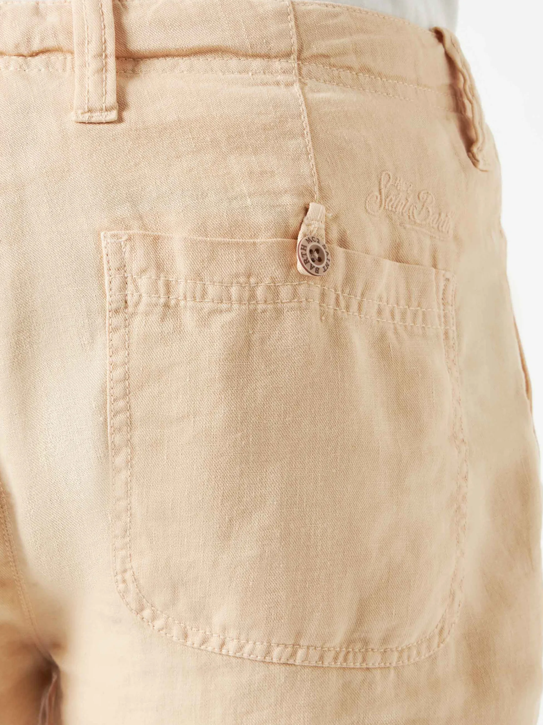 Bermuda in puro lino. Short casual per il tempo libero, tinta unita beige, vestibilità comfort, bottoni chiusi e coulisse in vita, due tasche sui fianchi e dietro senza pattina, due bottoni extra all’interno, grafica St. Barth blu, lunghezza al ginocchio. Disegnato a St. Barth. Composizione: 100% lino. Modello Filicudi 11.