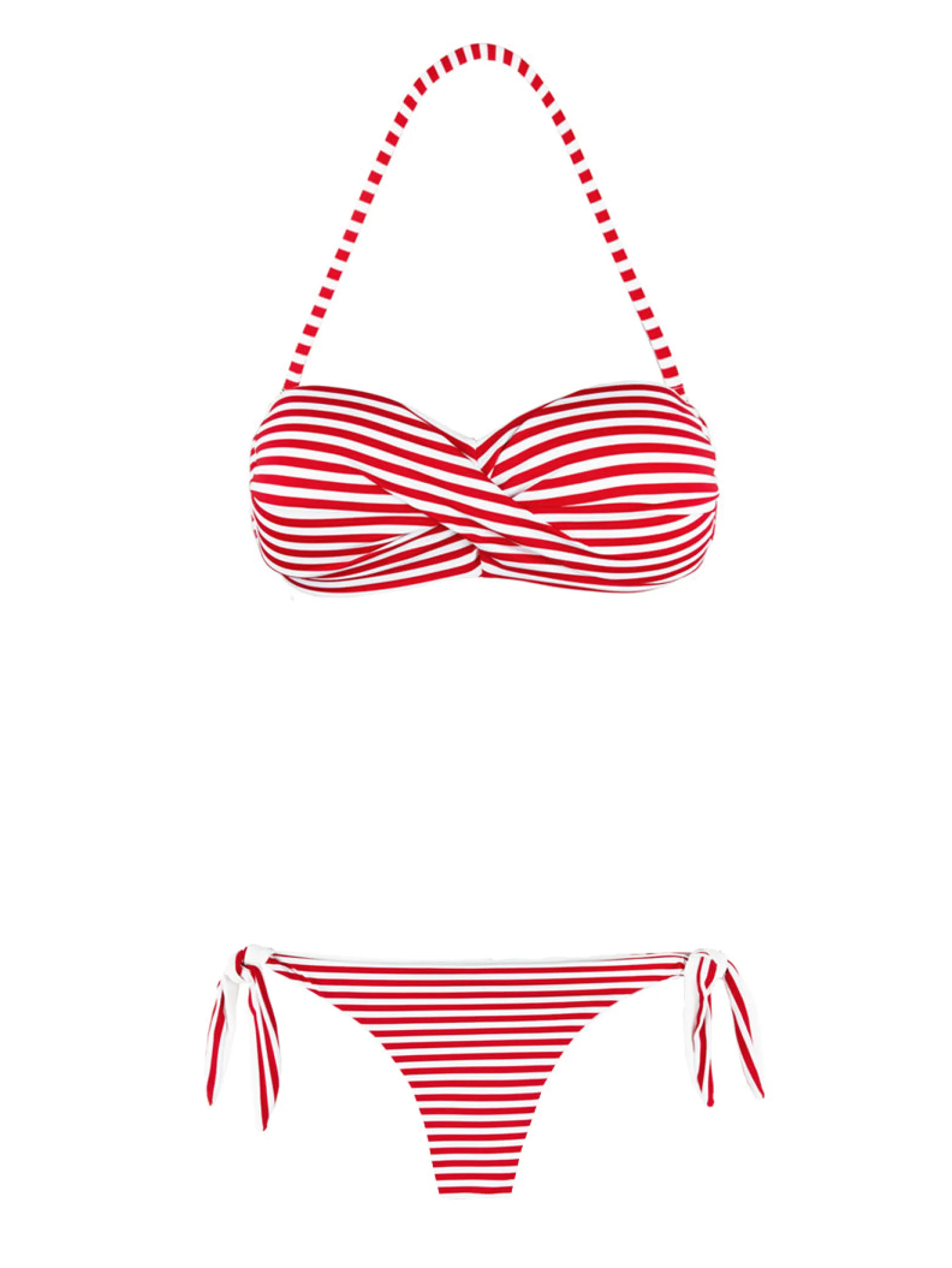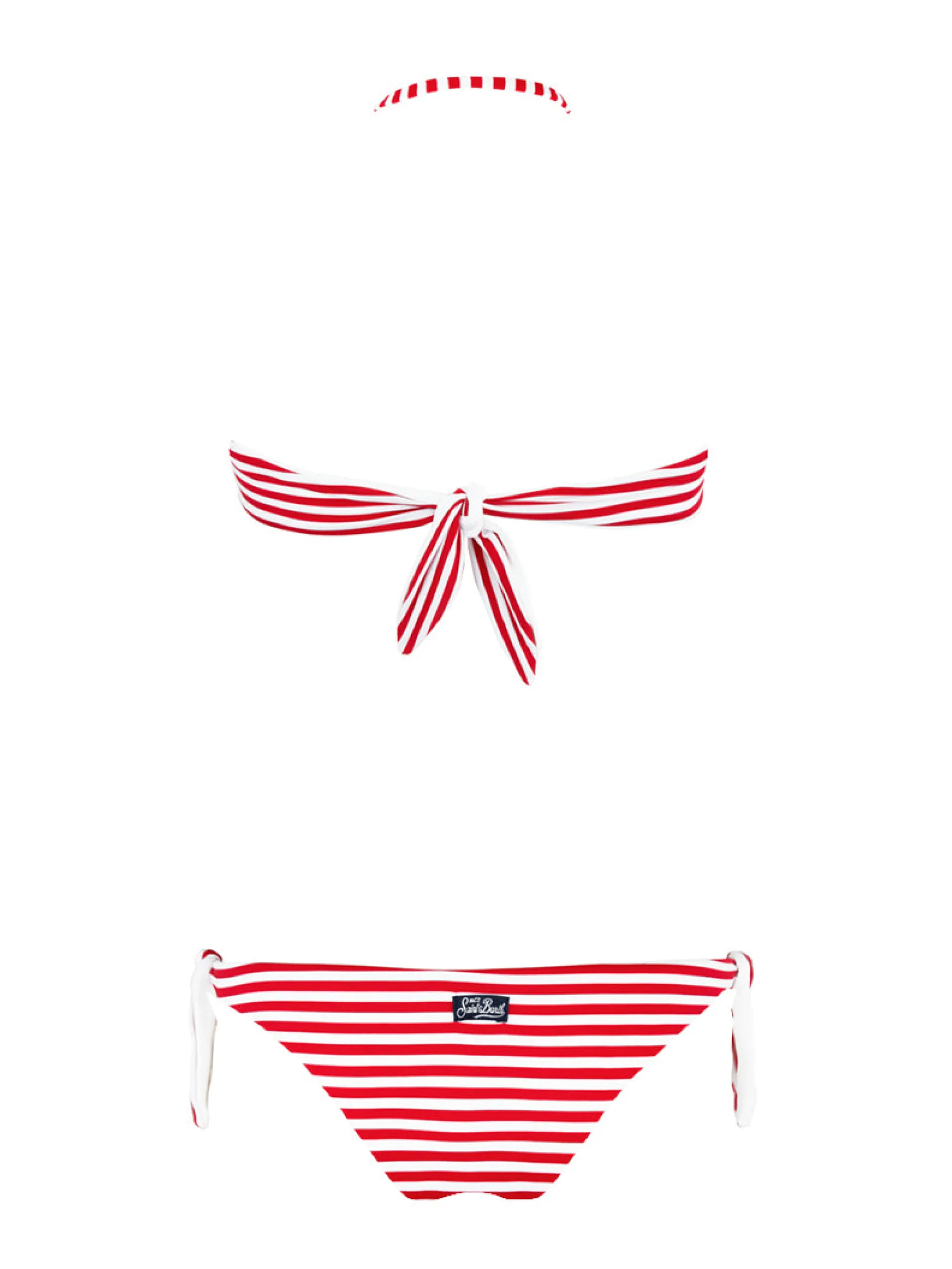 Top Tiarè: fascia drappeggiata, fantasia a righe rosse, imbottitura removibile e laccio al collo.