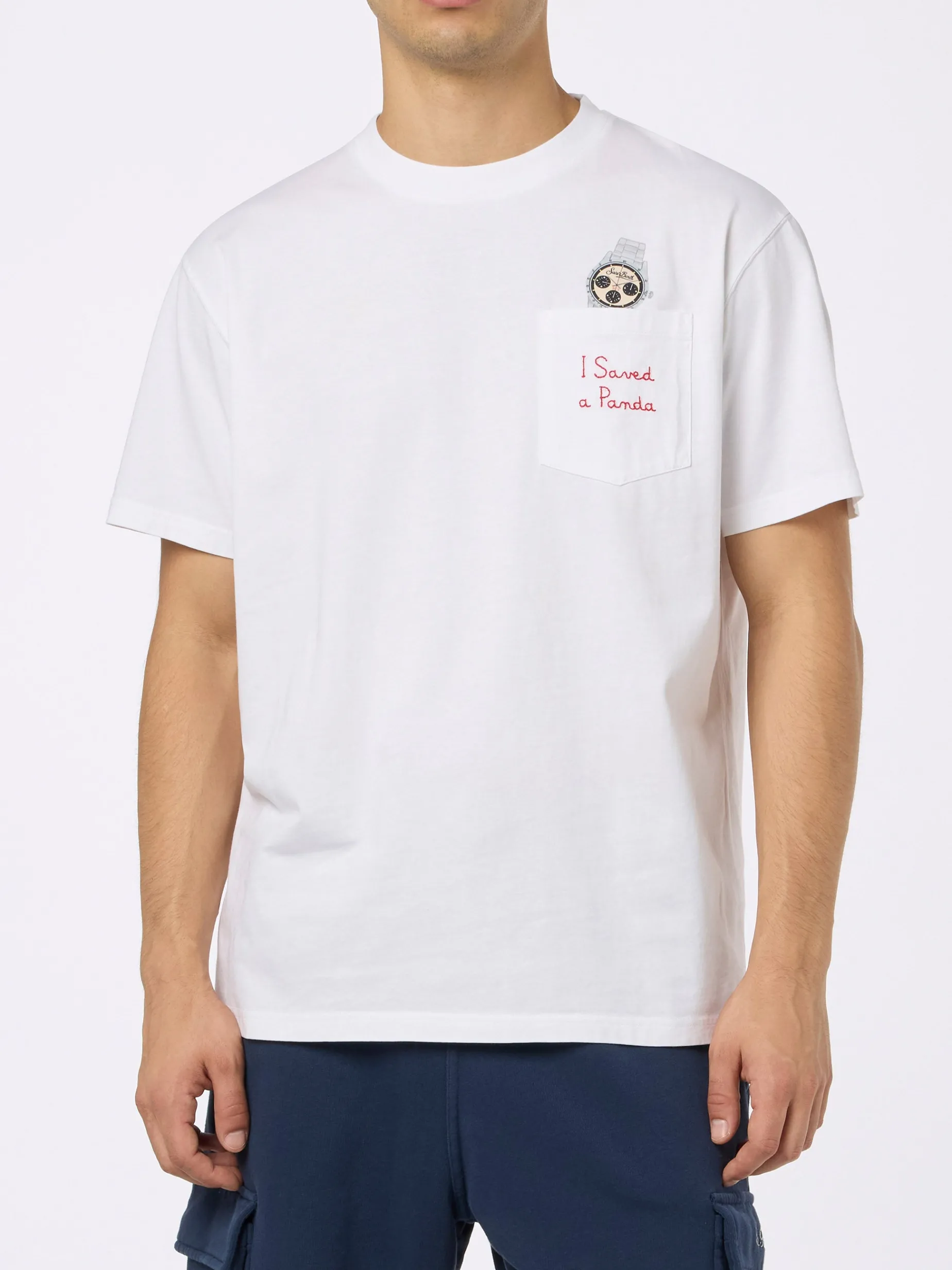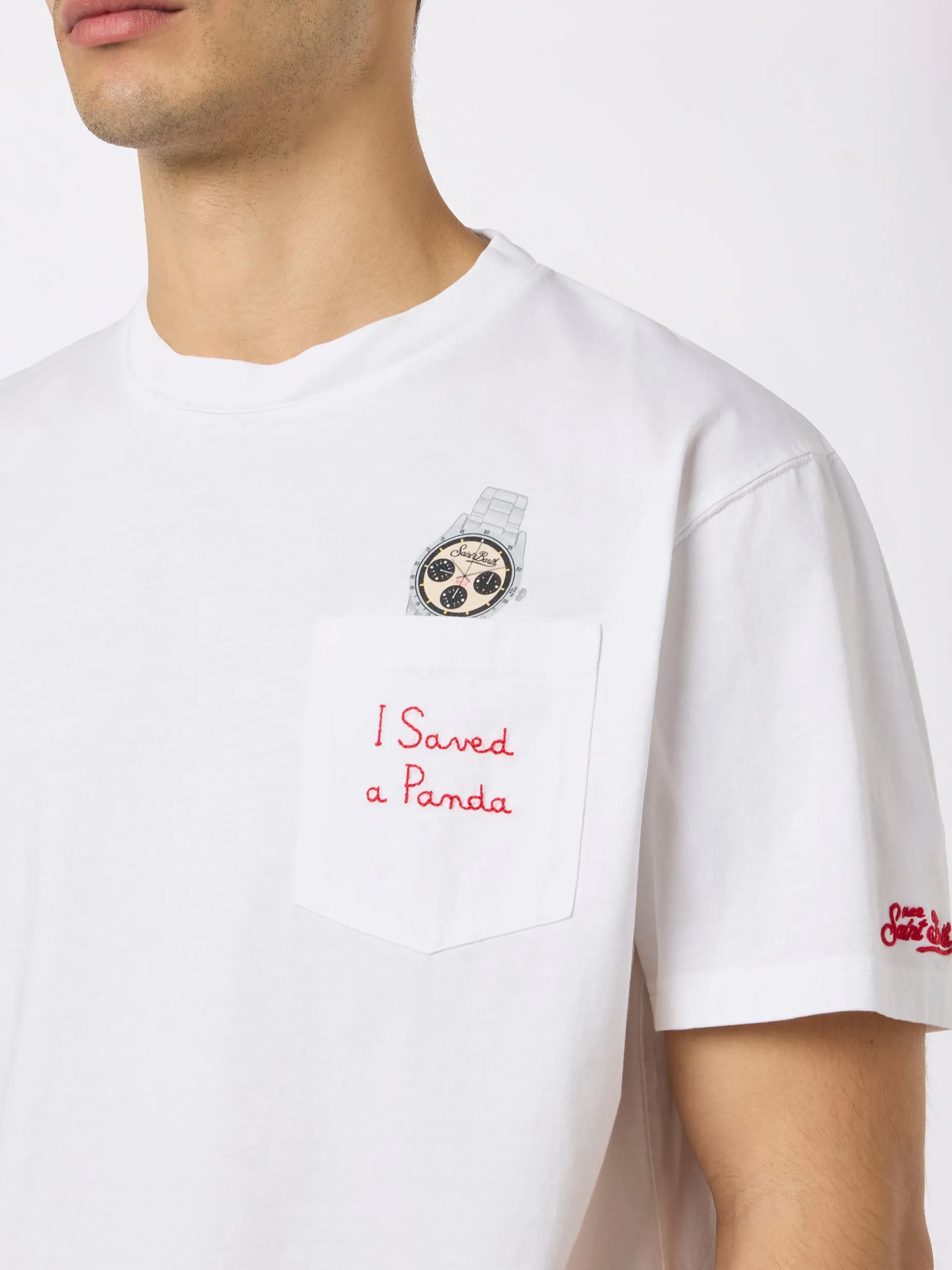Tasca applicata sul petto sinistro con ricamo “I saved a Panda” e stampa dell’orologio