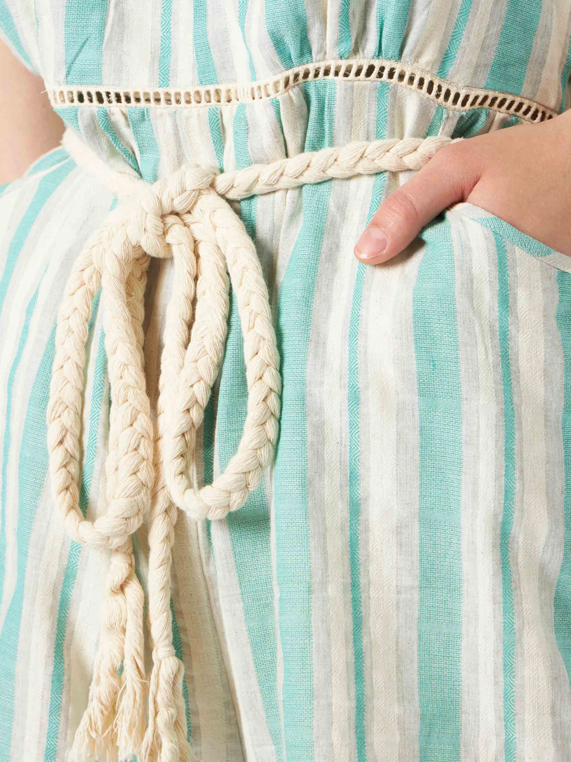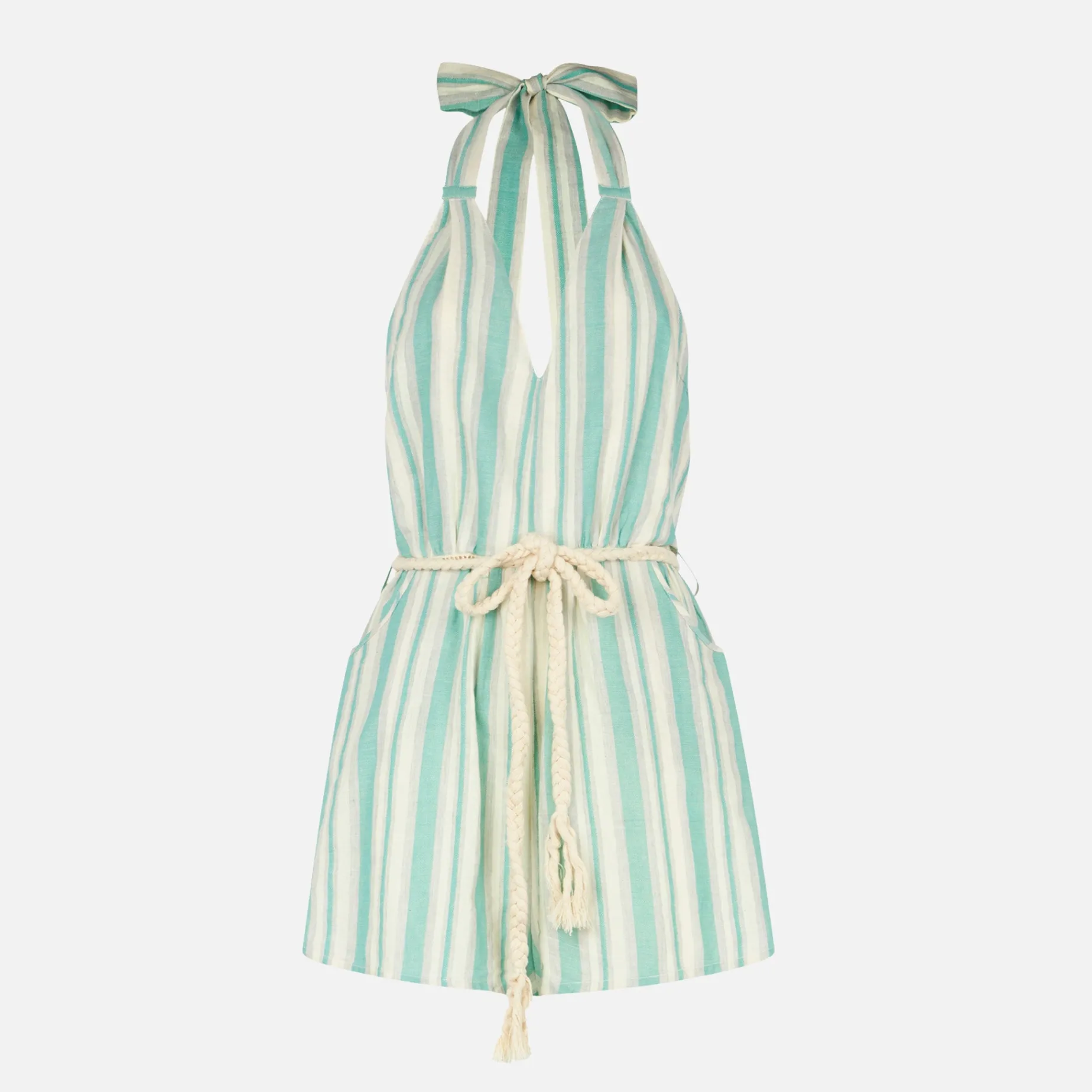 Tuta, Made in Italy. Righe azzurre, modello corto, abito in puro cotone con cintura in tela, scollo a V, senza maniche.