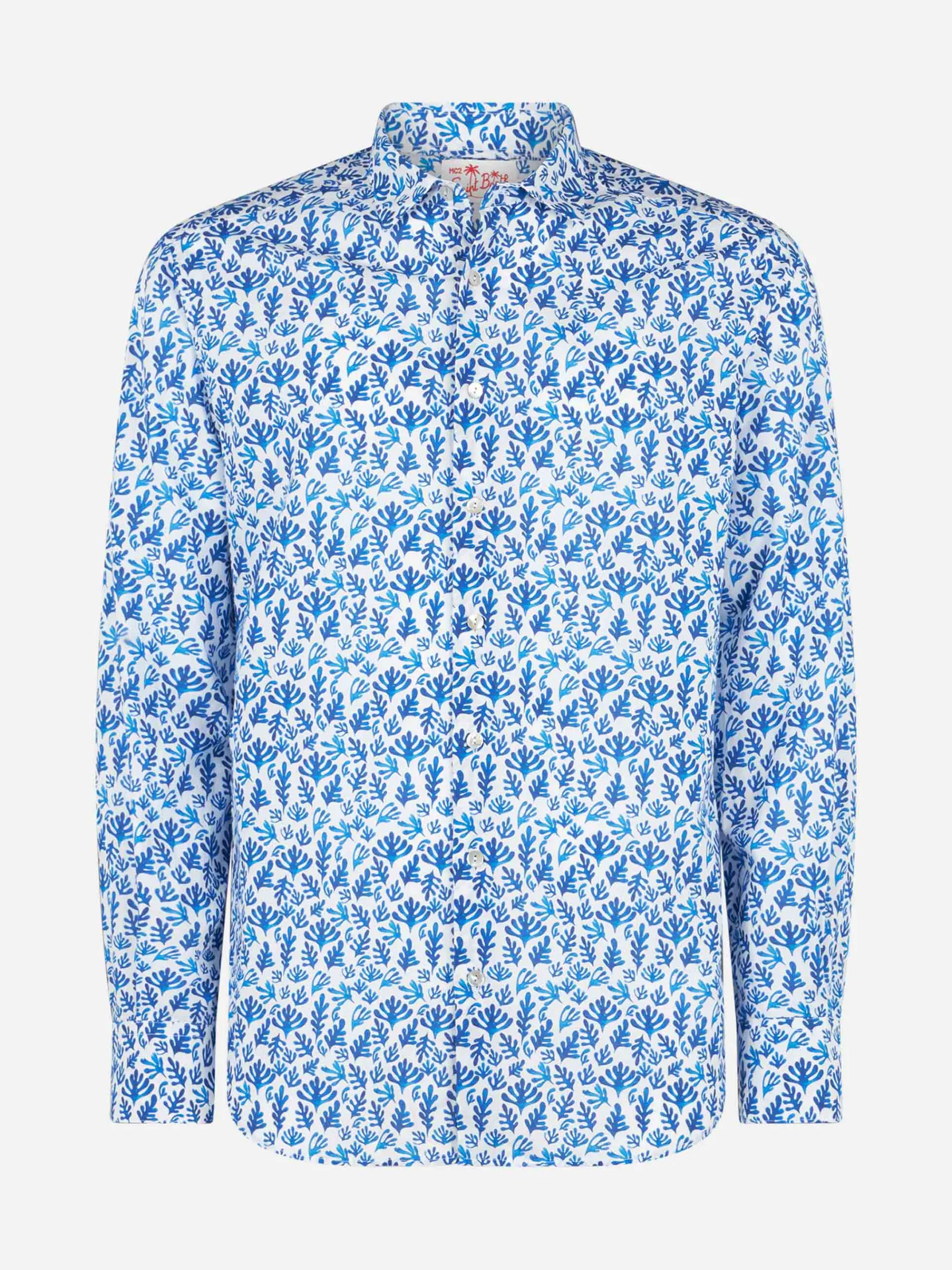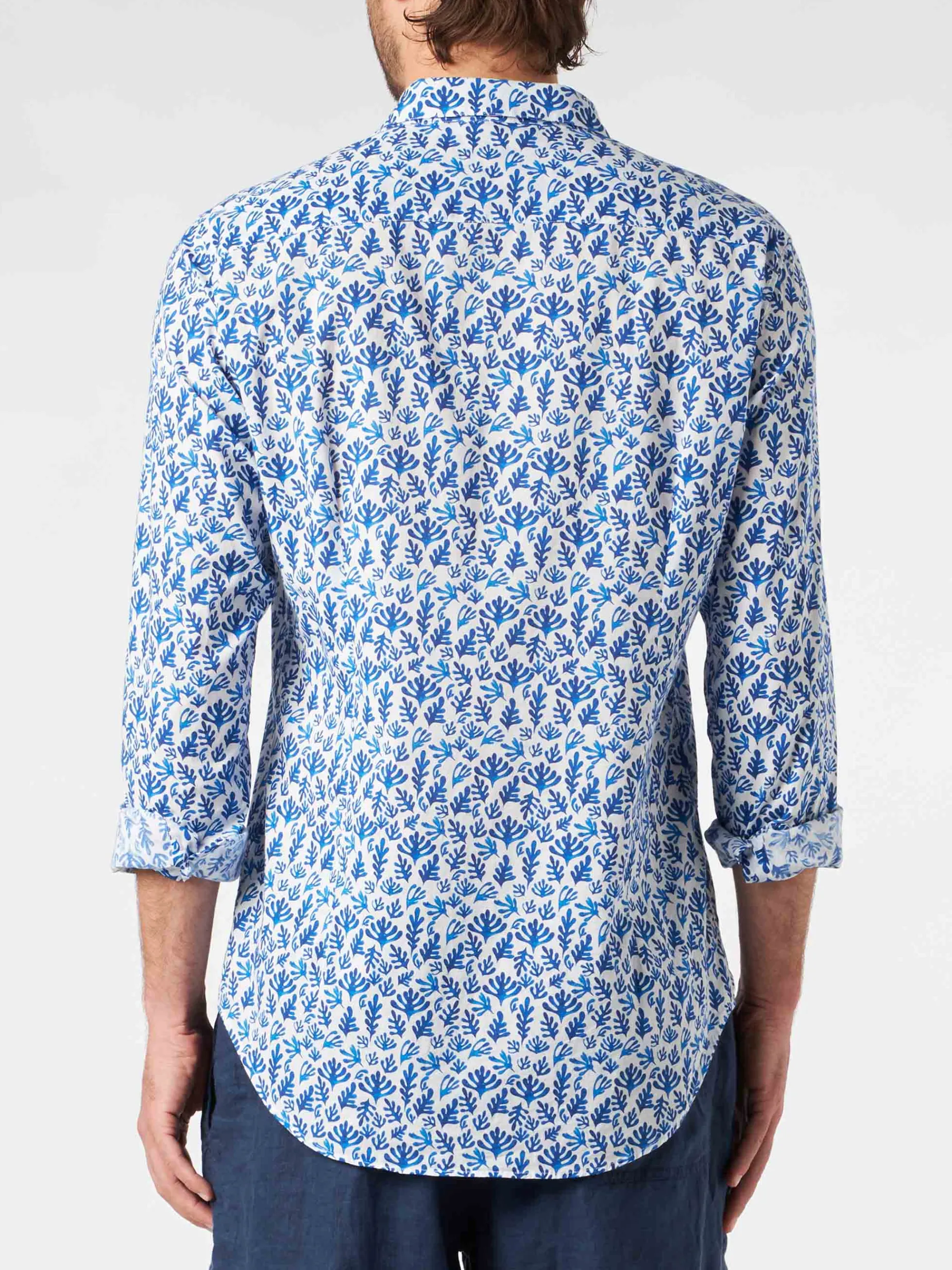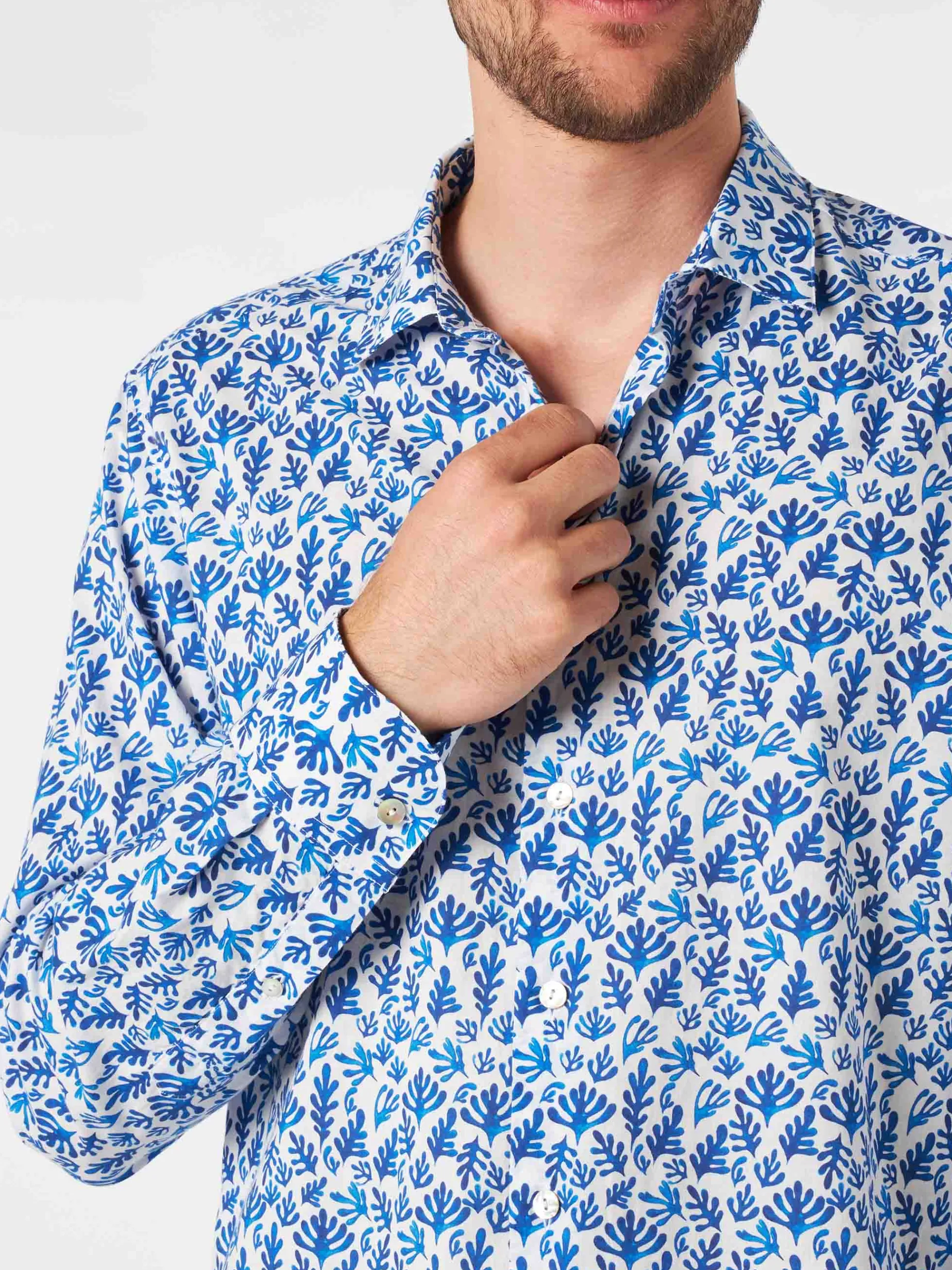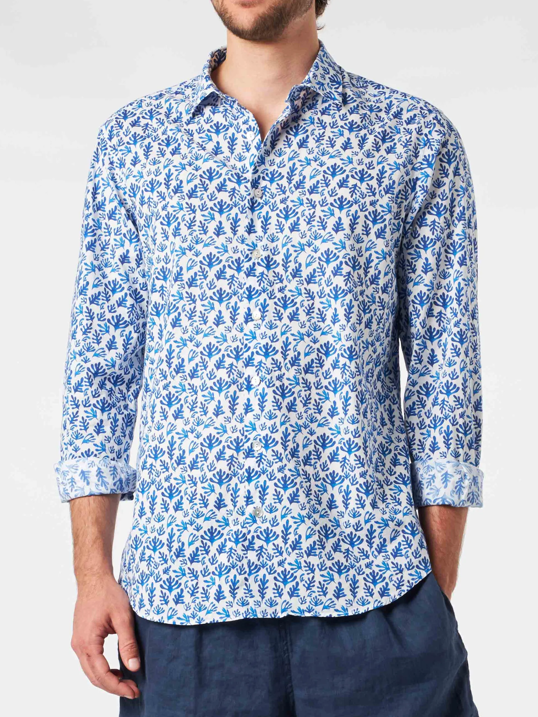 Camicia da uomo Sikelia in mussola di cotone con stampa foglie blu