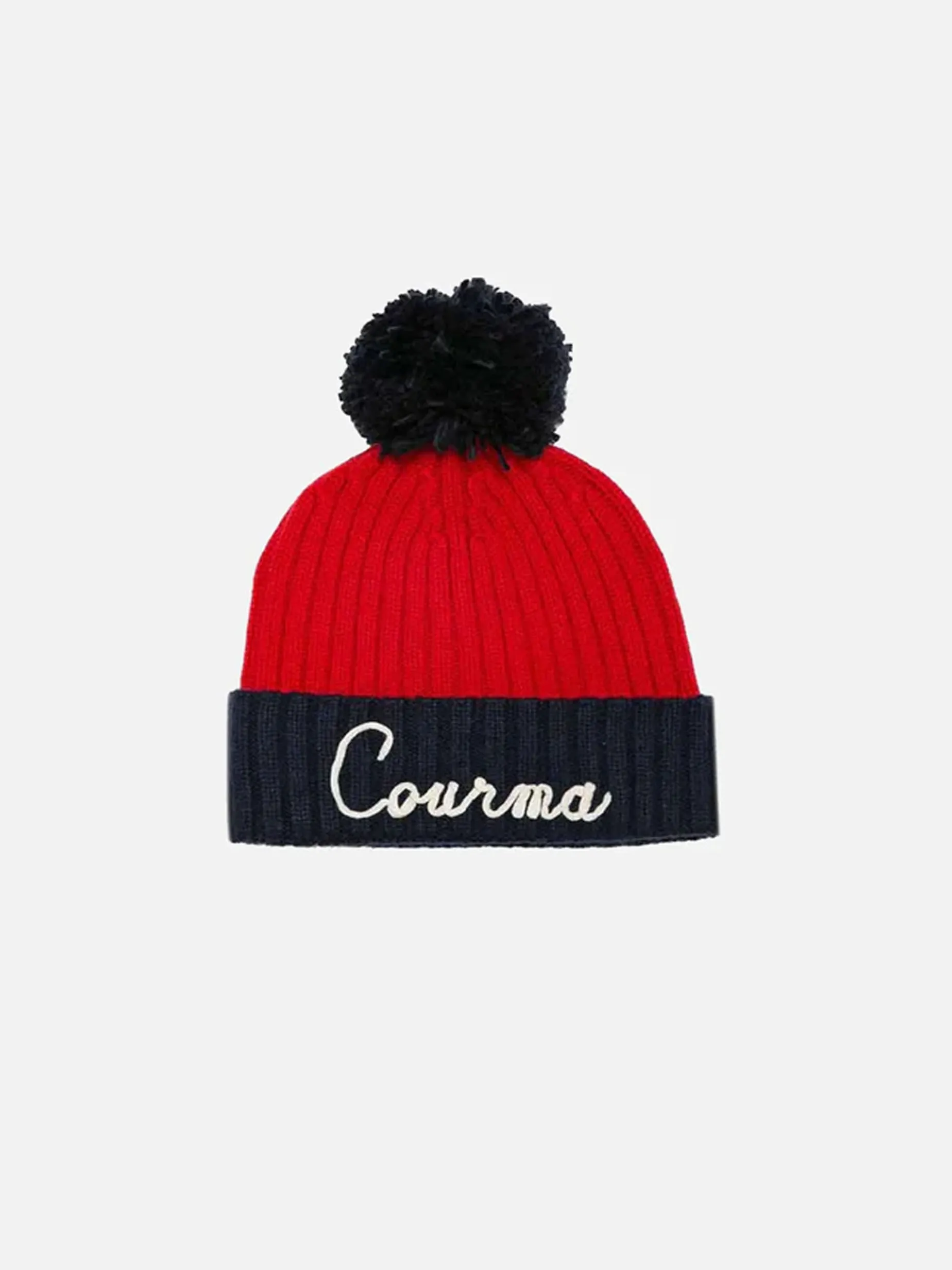 Cashmere misto blu e rosso con pompon