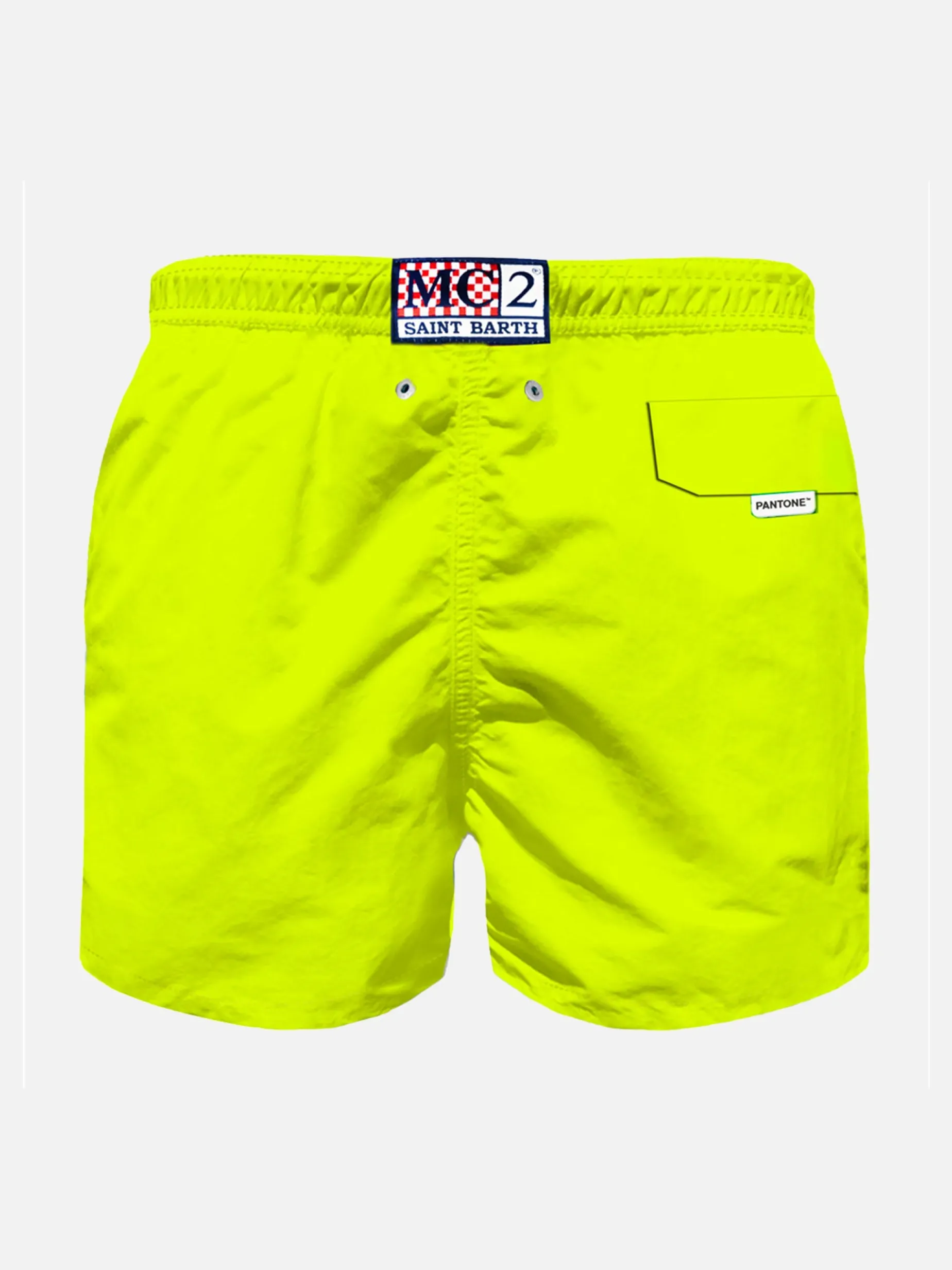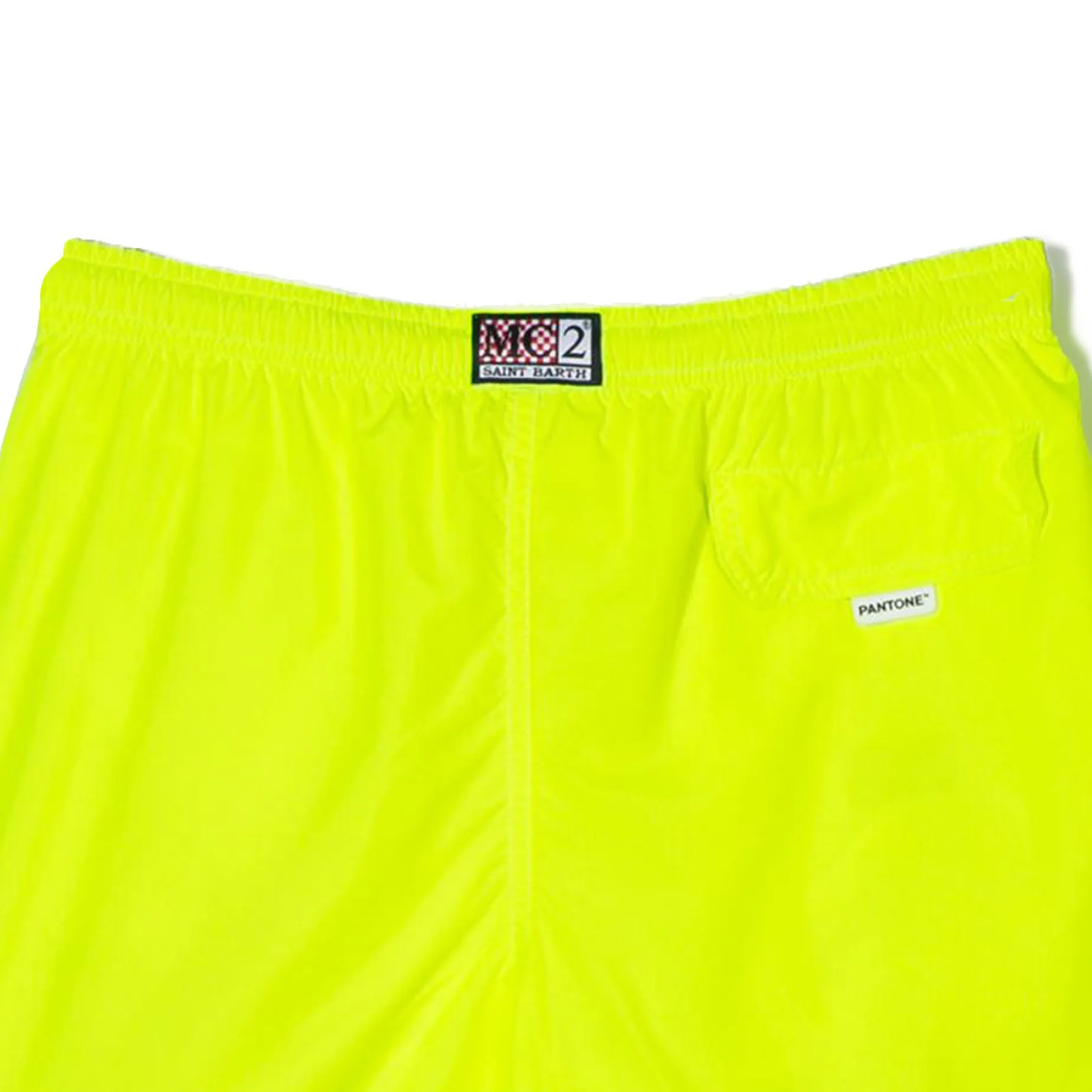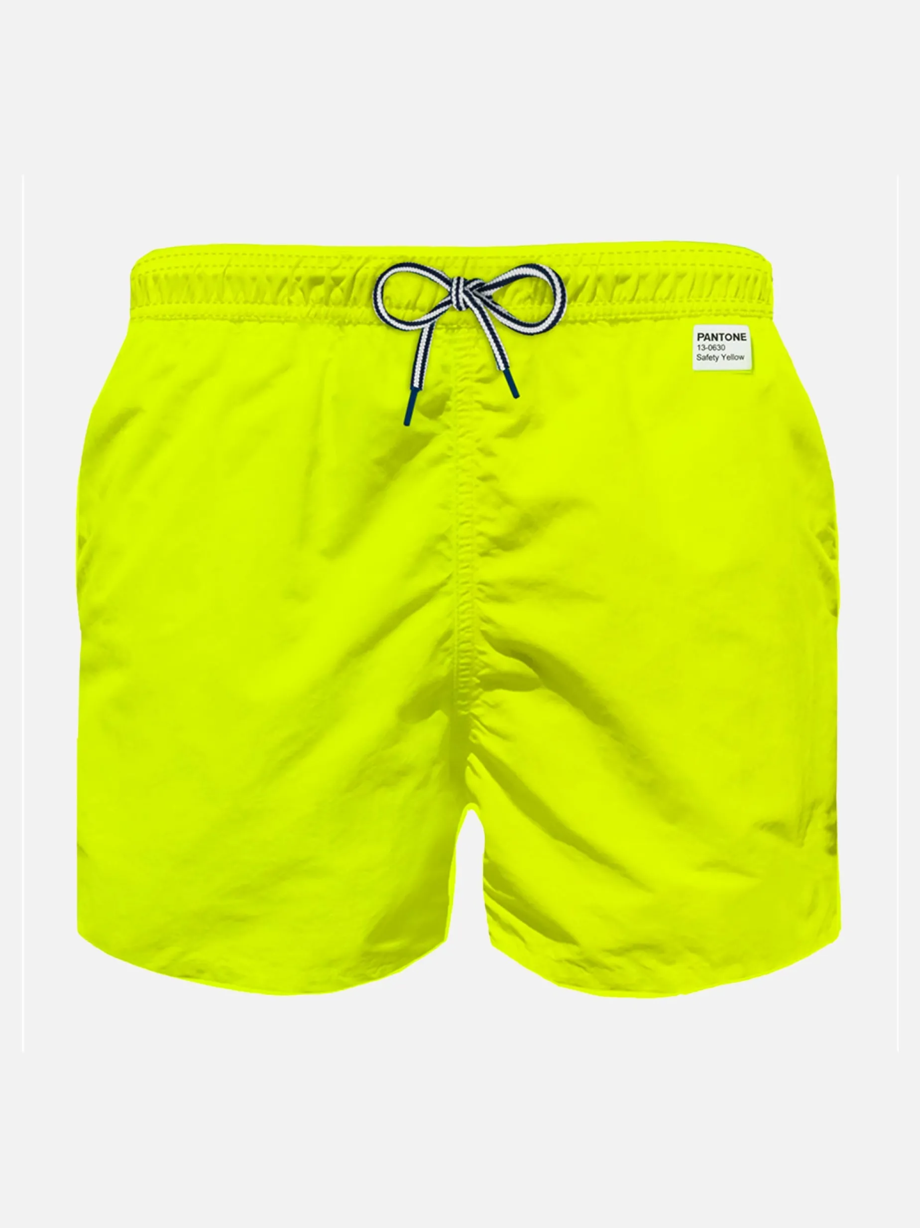 Costume da bagno per bambino ultraleggero, asciugatura rapida, tinta unita giallo fluo Pantone, lunghezza media, vestibilità regolare, slip interno ergonomico, chiusura con coulisse, tasche su entrambi i lati, tasca posteriore con chiusura magnetica, Pantone Label davanti metallica e dietro in gomma. Il costume da bagno può essere ripiegato nella tasca posteriore trasformandosi in un perfetto marsupio da viaggio.