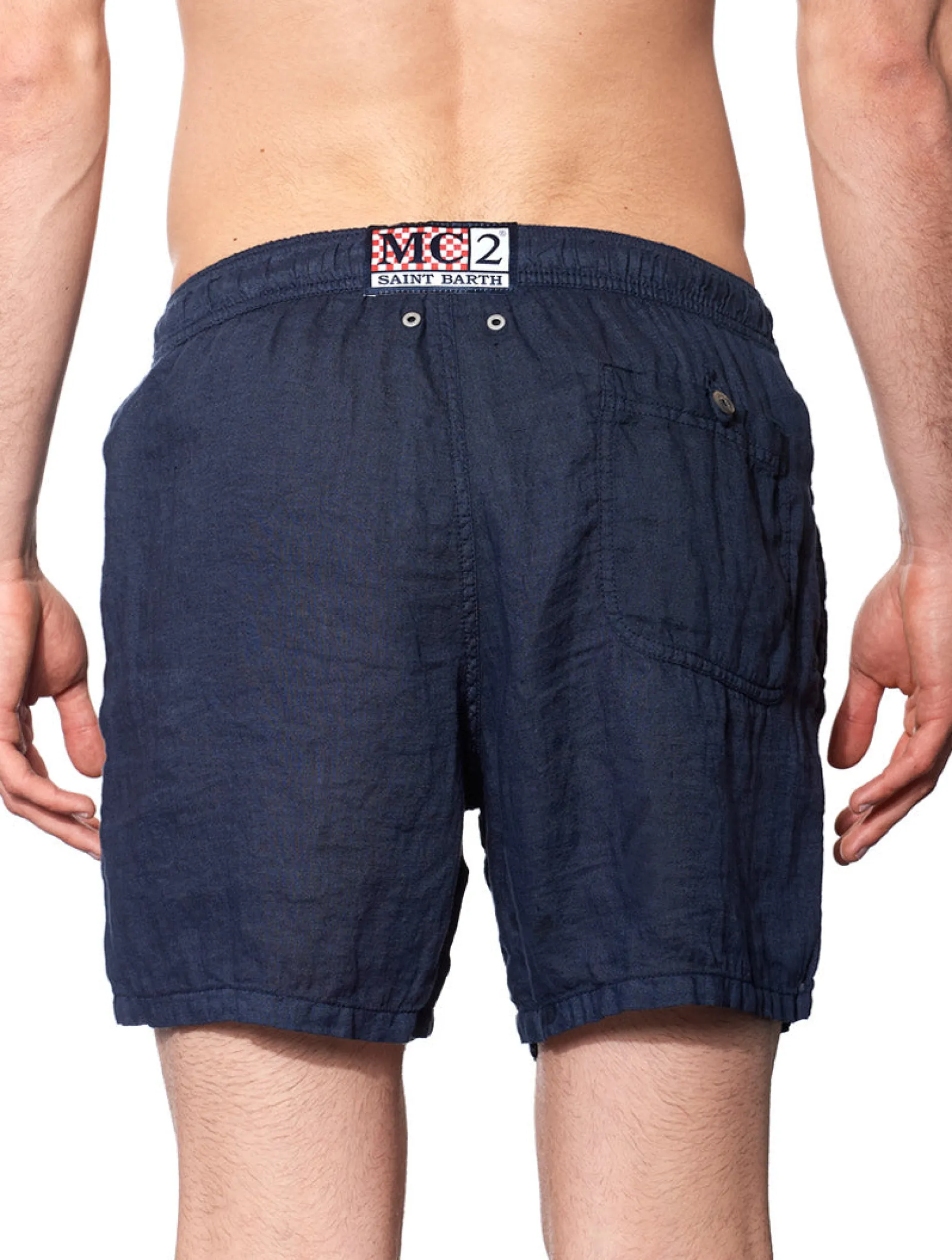 Costume da bagno in lino di media lunghezza blu tinta unita