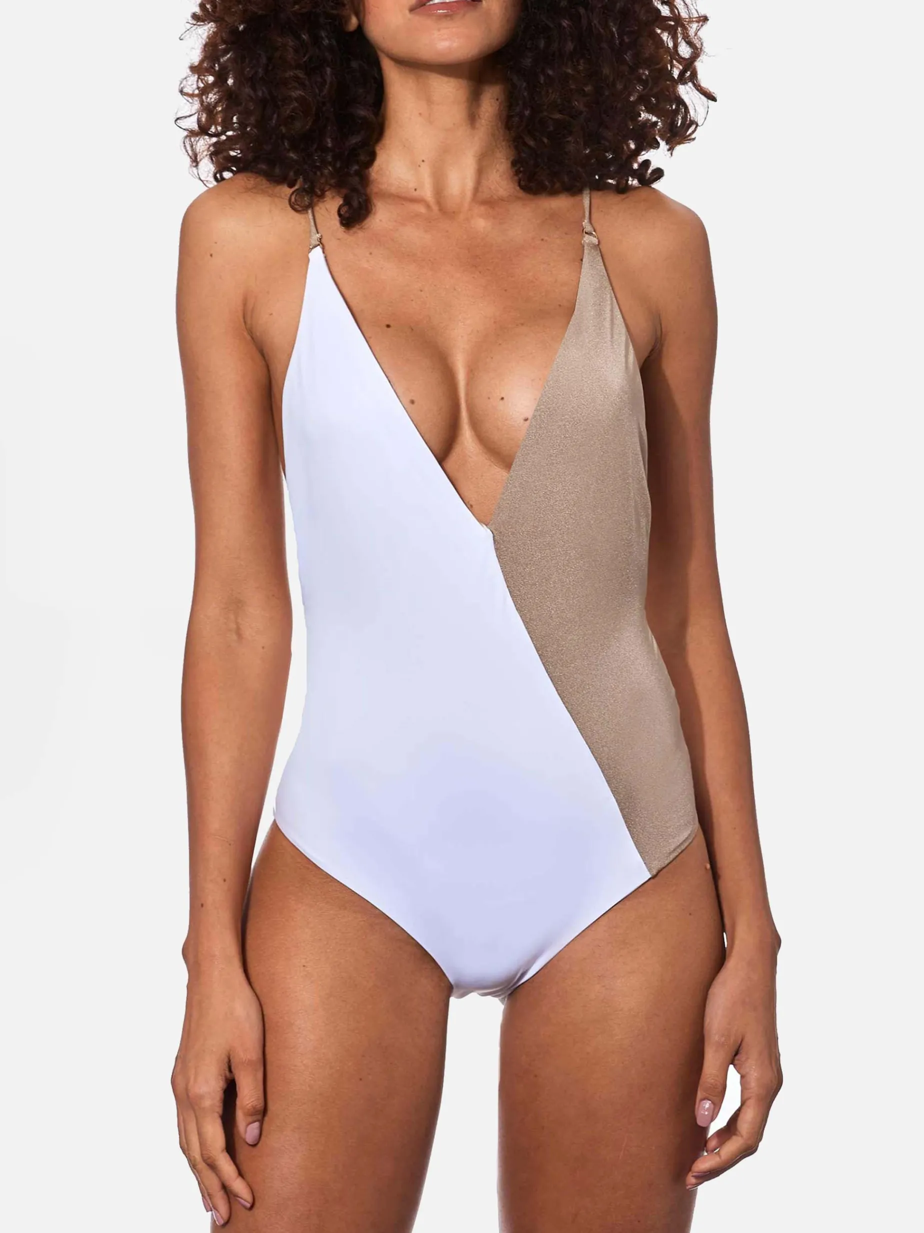 Costume intero plissettato plissettato, spalline incrociate, bianco e grigio lucido effetto luccicante, elasticizzato, vestibilità regolare, Lycra Composizione: 90% poliammide, 10% elastan.