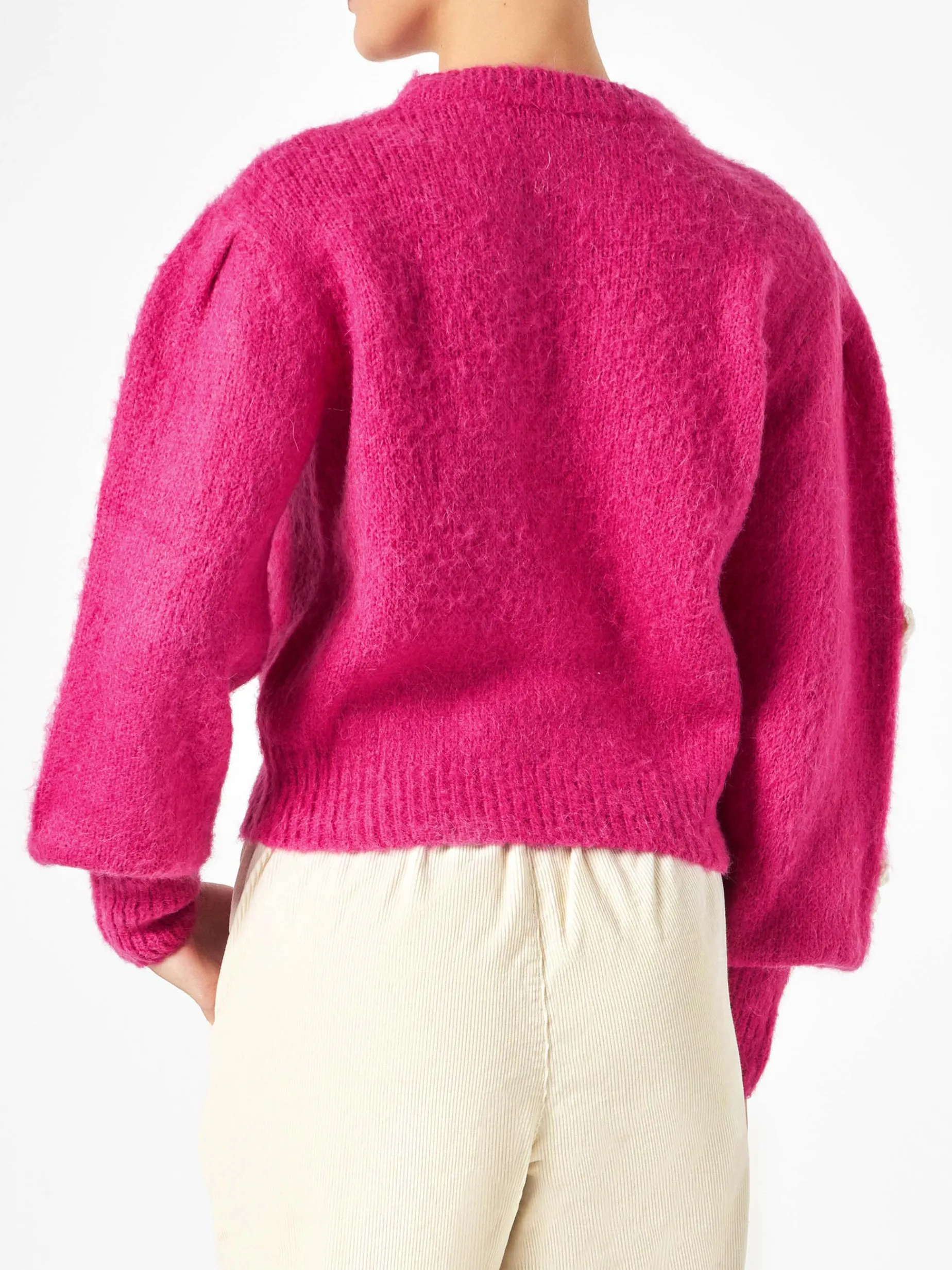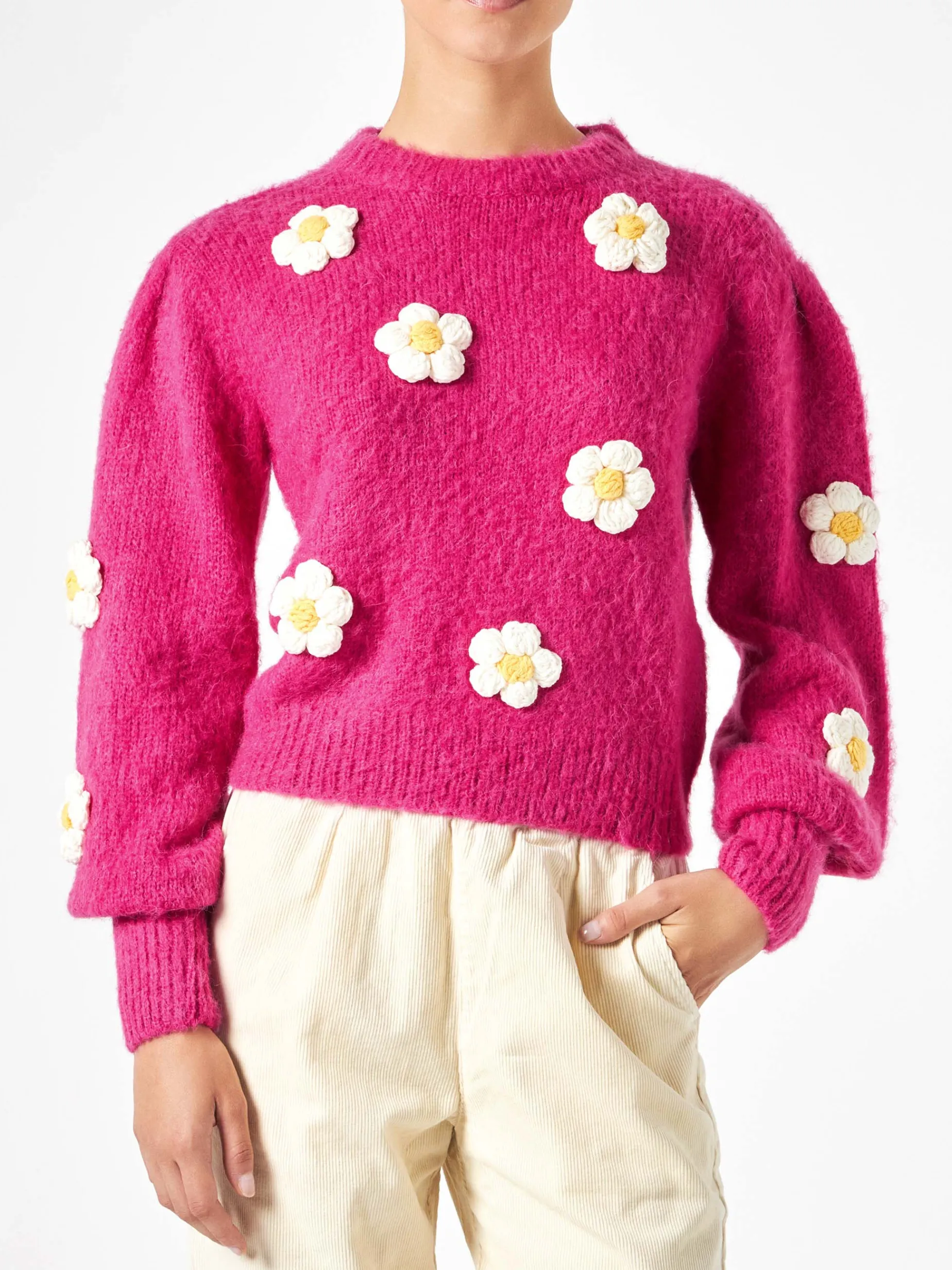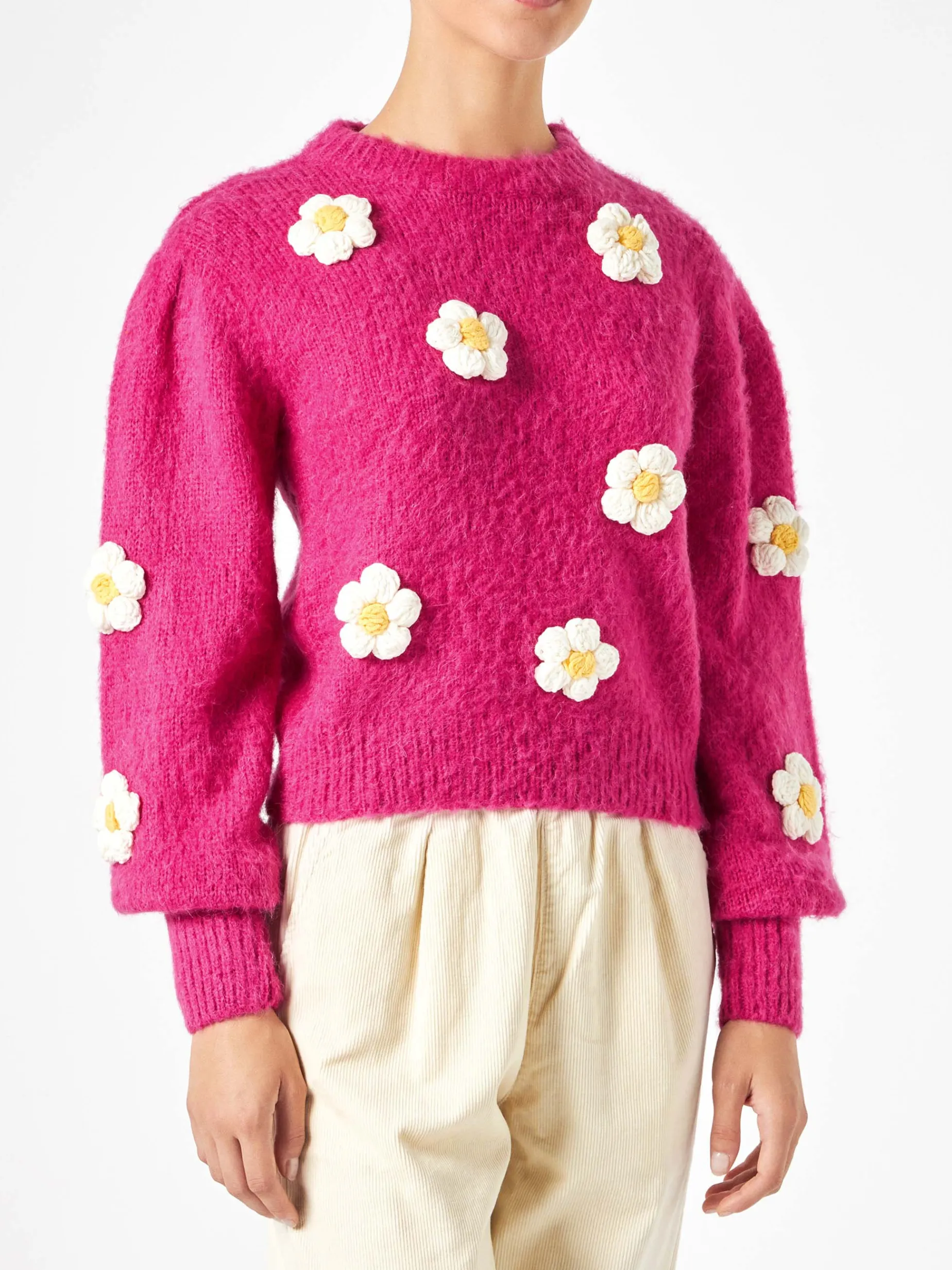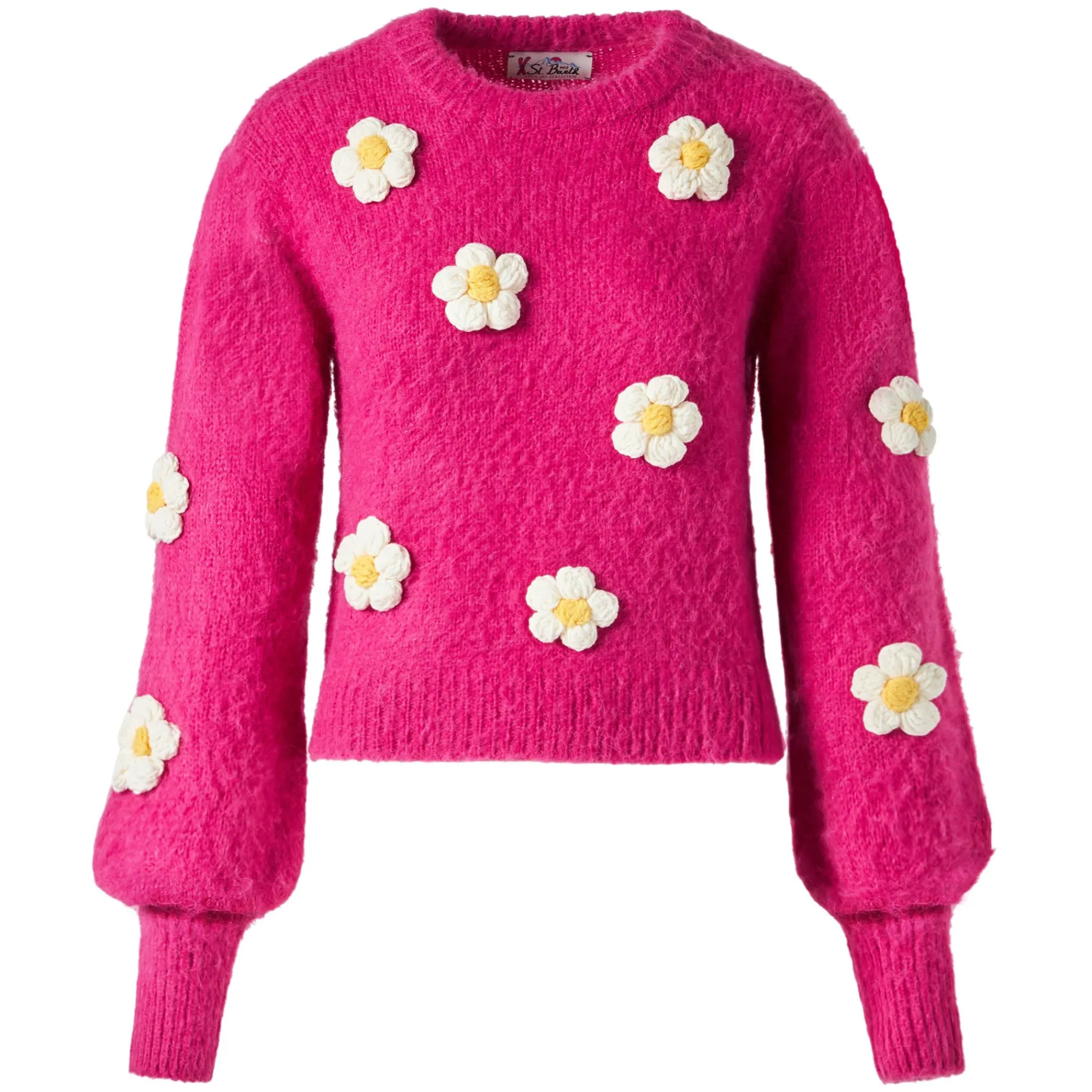 Applicazioni di fiori all’uncinetto sul davanti e sulle maniche