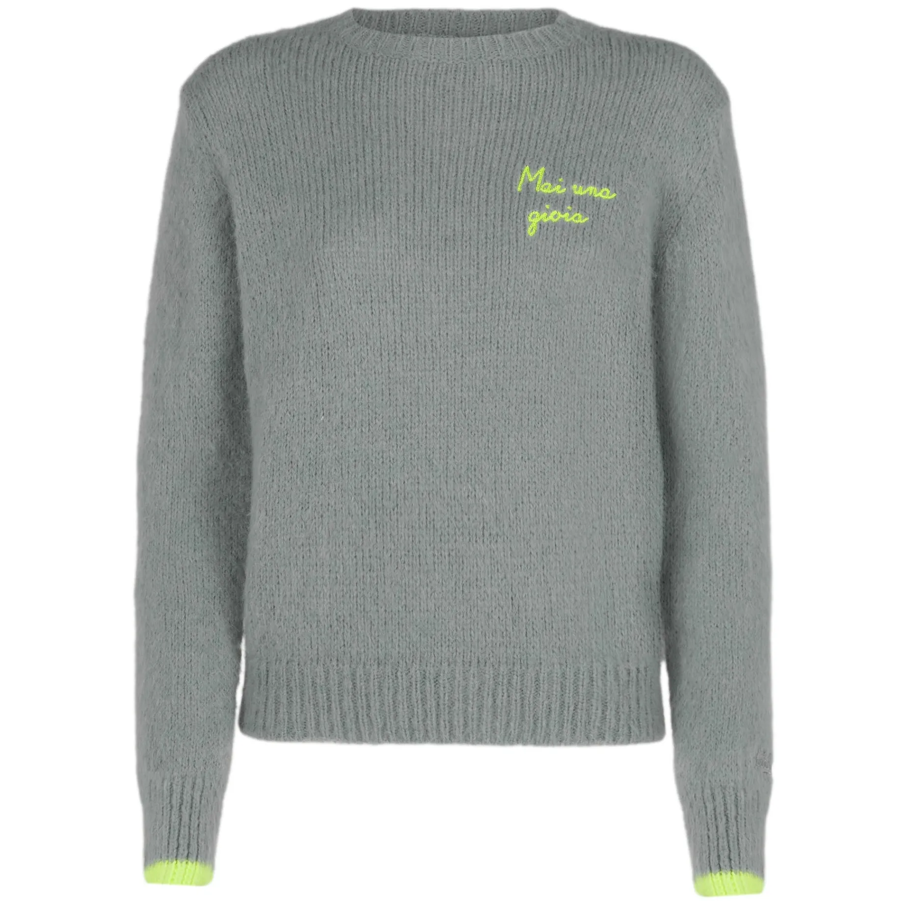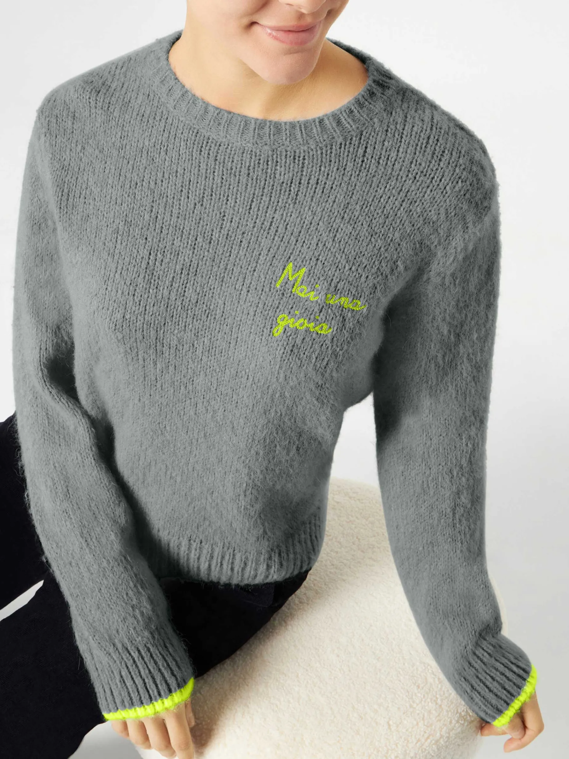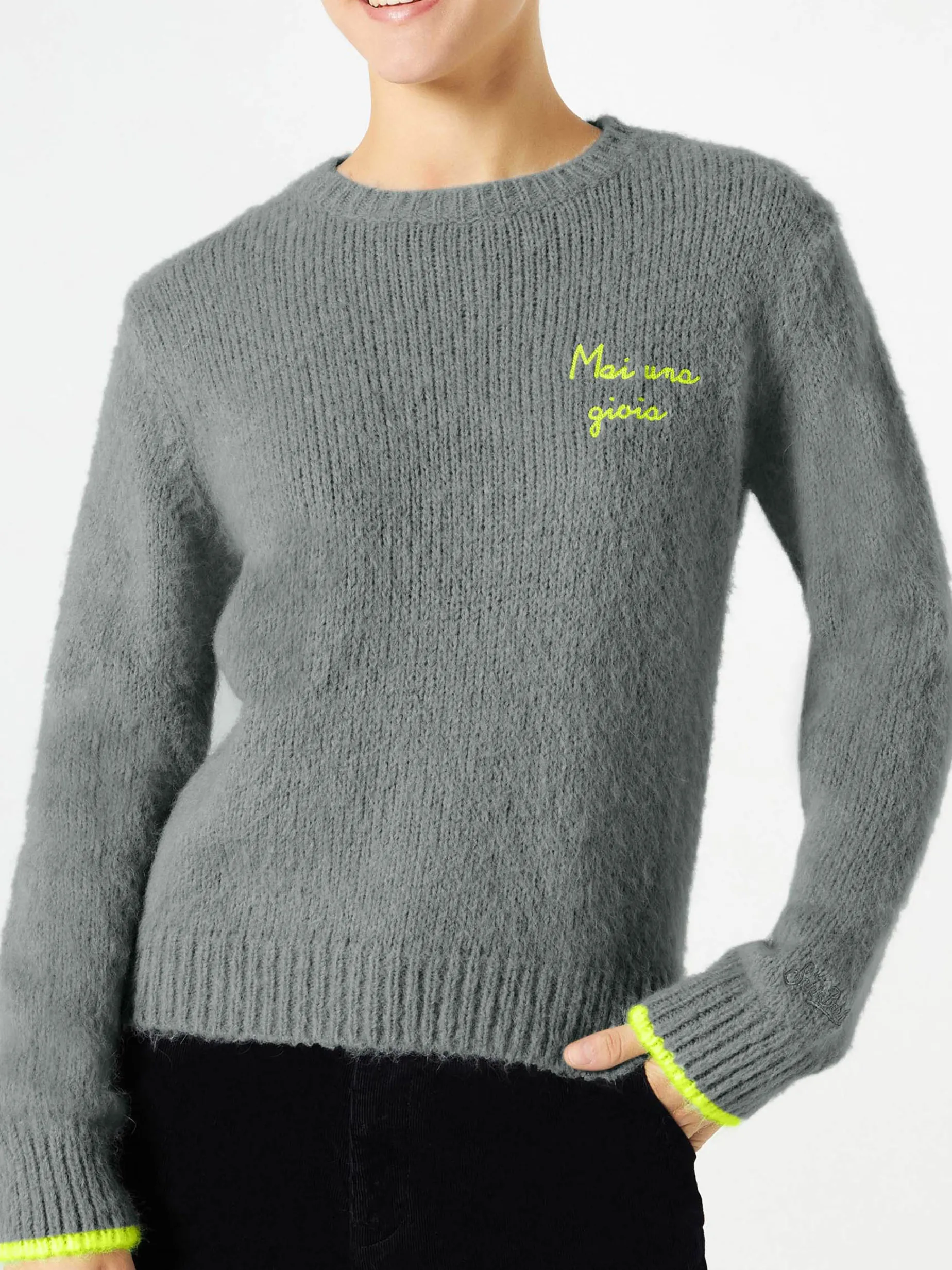 Ricamo Mai una gioia giallo fluo su fondo grigio