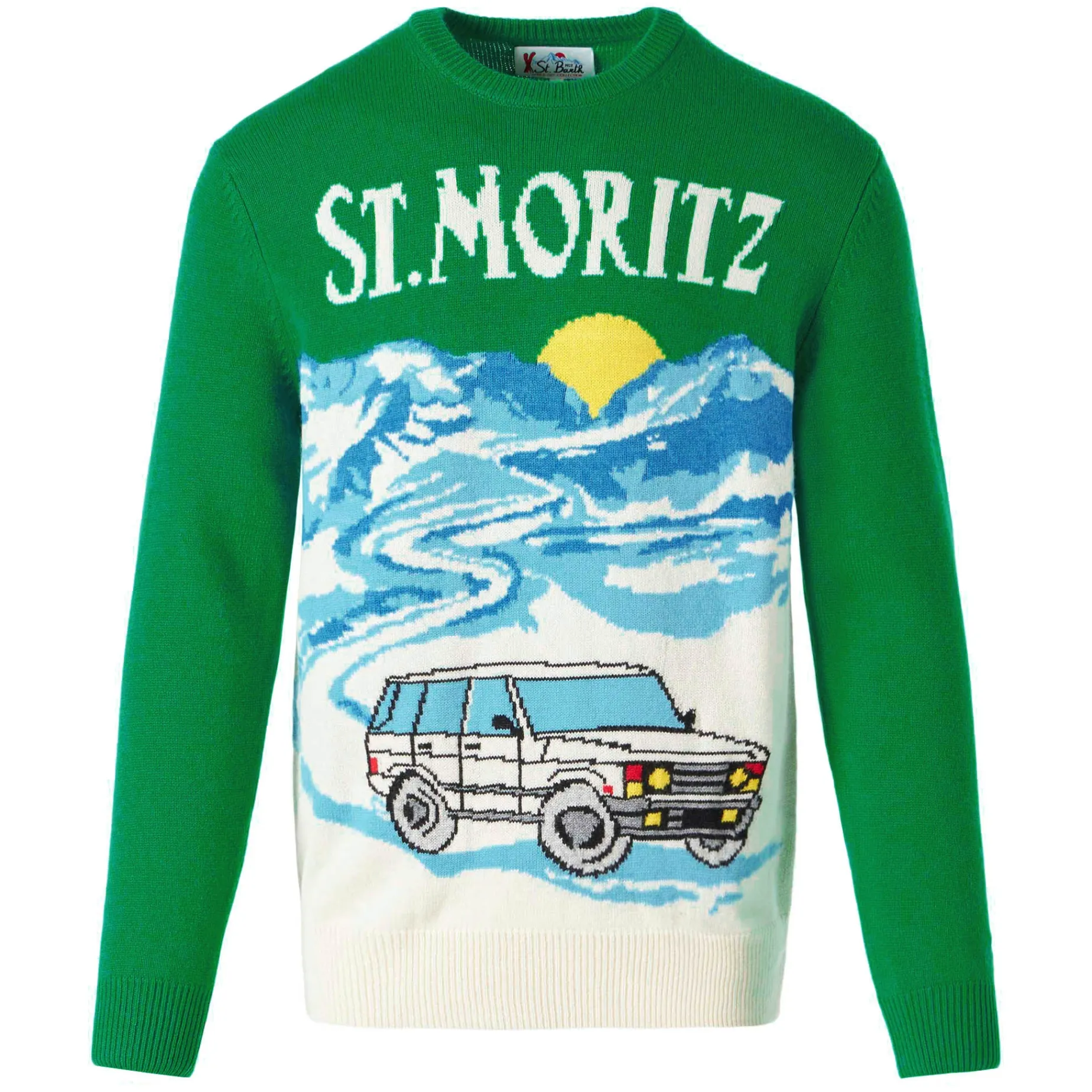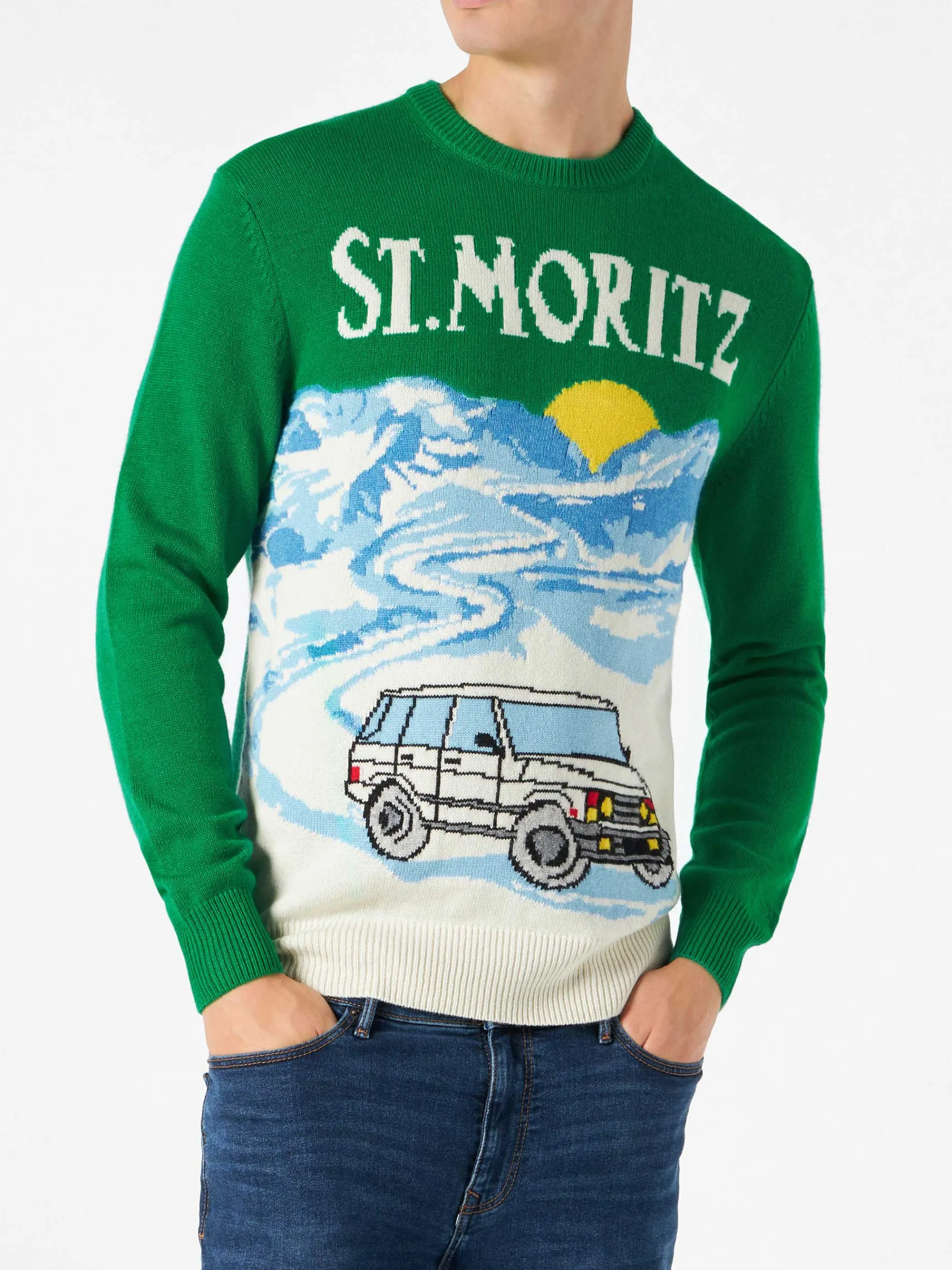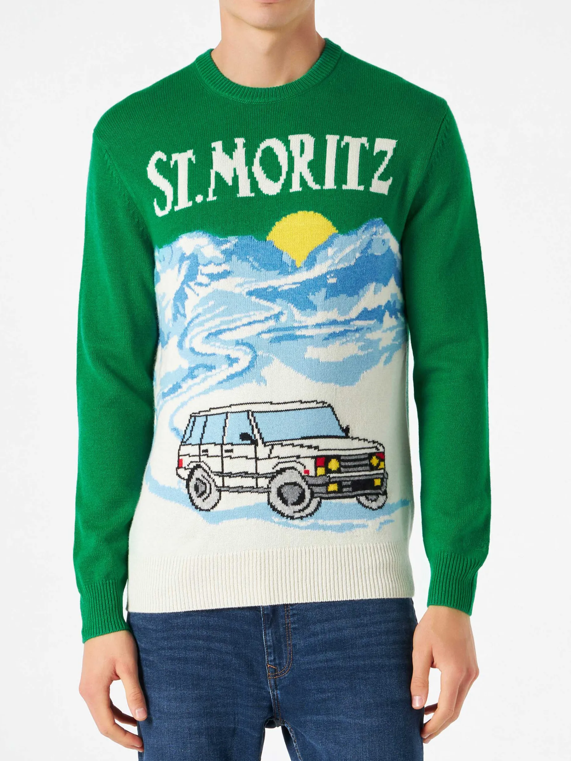 Maglia da uomo verde con stampa cartoline di St.Moritz