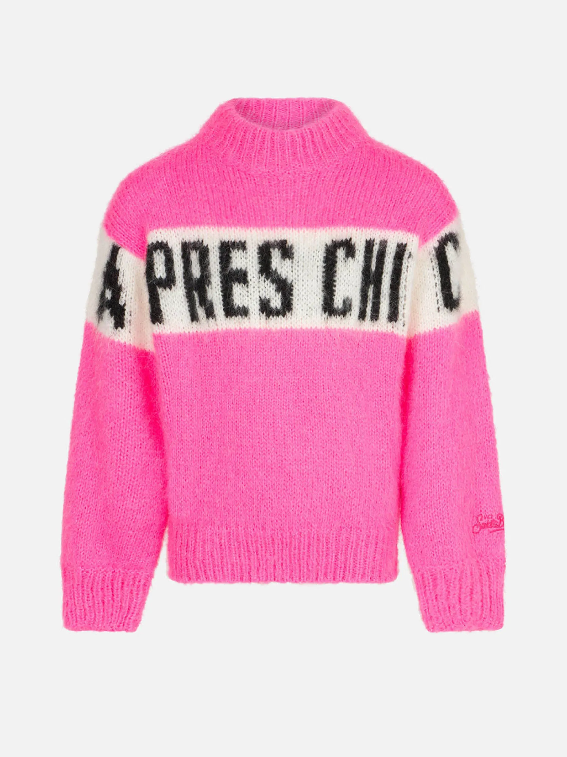 Maglione da bambina girocollo garzato con scritta Apres chic