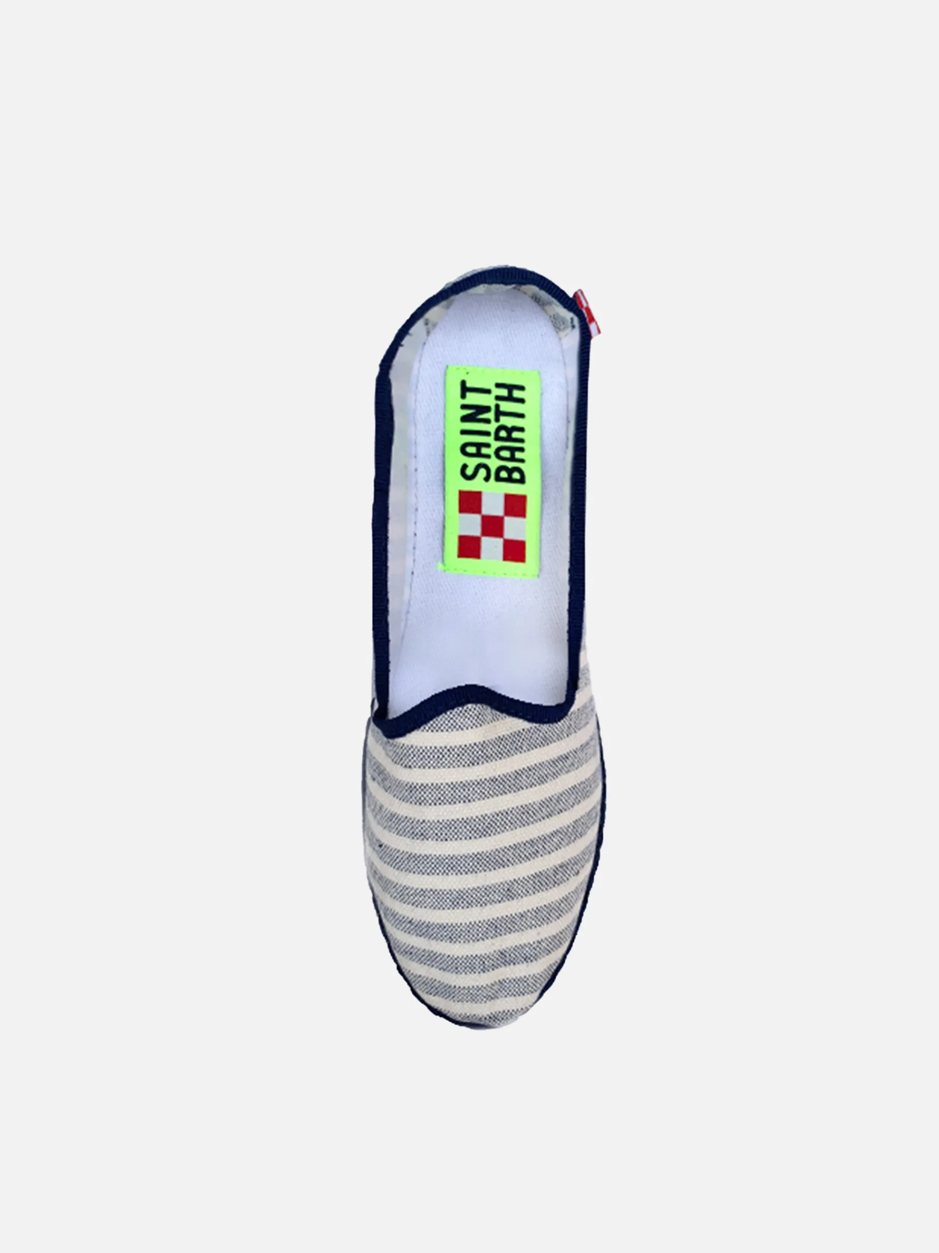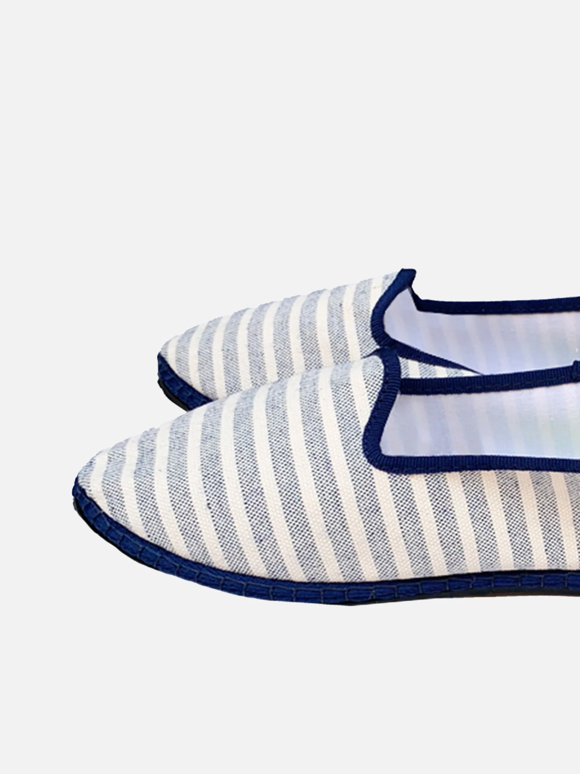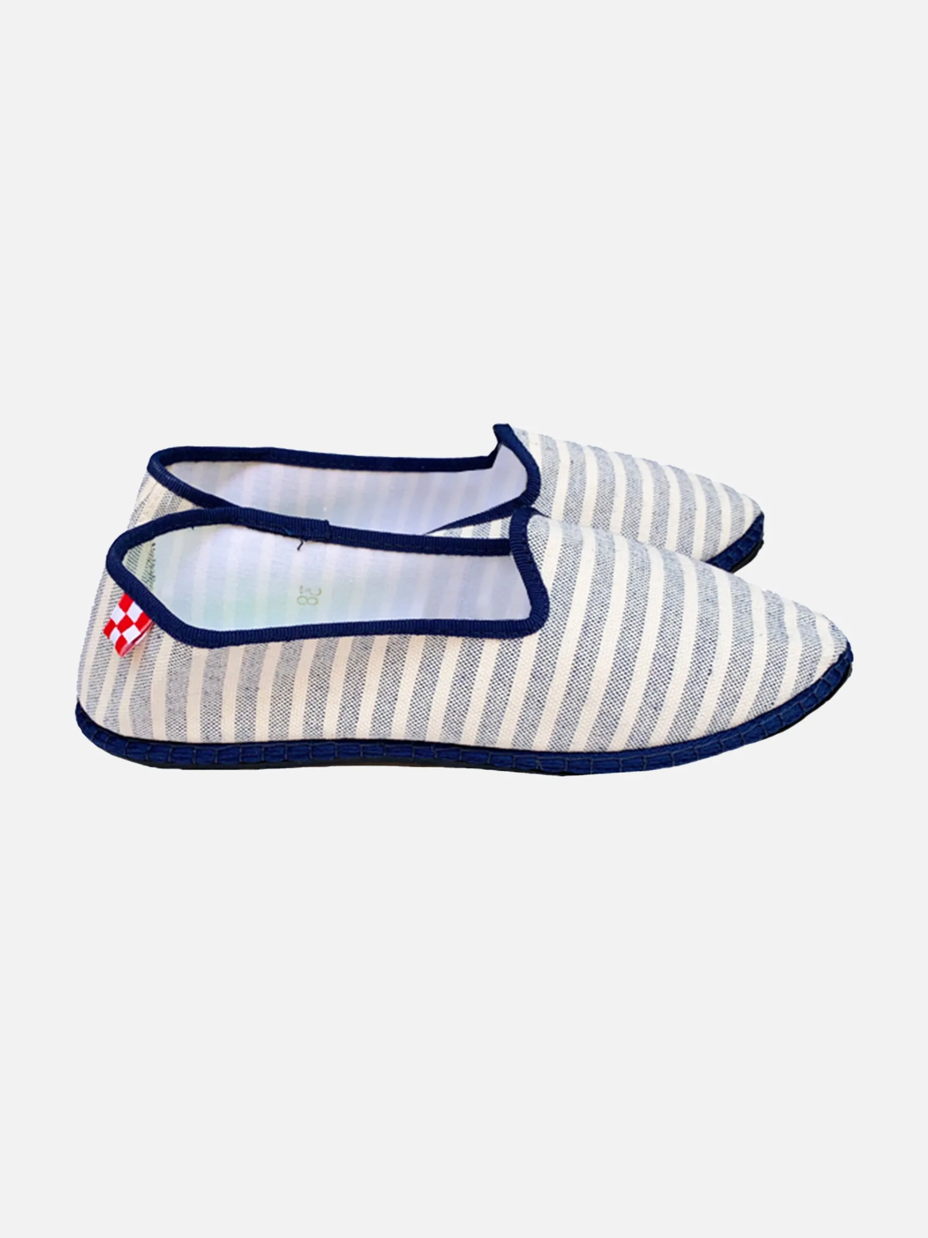 Pantofole a righe sottili blu “Friulane”, artigianali made in Friuli Venezia Giulia, perfette per il tuo tempo libero. Tomaia in tela naturale, suola in gomma. Fatto in casa in Italia