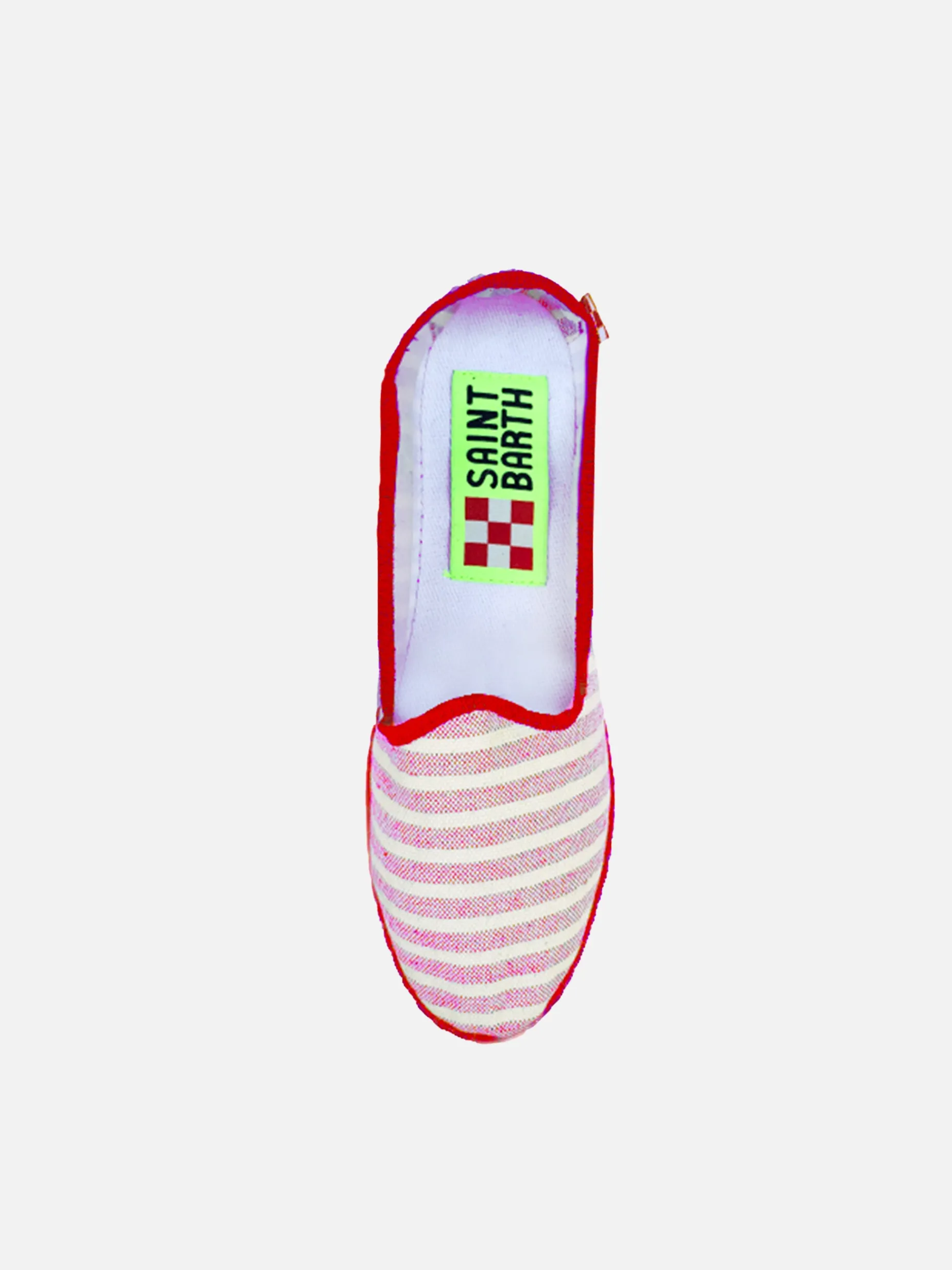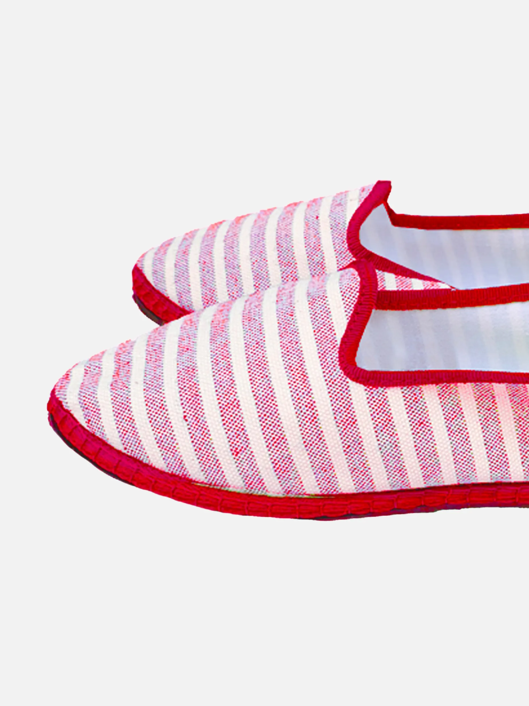 Pantofole rosse a righe sottili “Friulane”, artigianali made in Friuli Venezia Giulia, perfette per il tuo tempo libero. Tomaia in tela naturale, suola in gomma. Fatto in casa in Italia