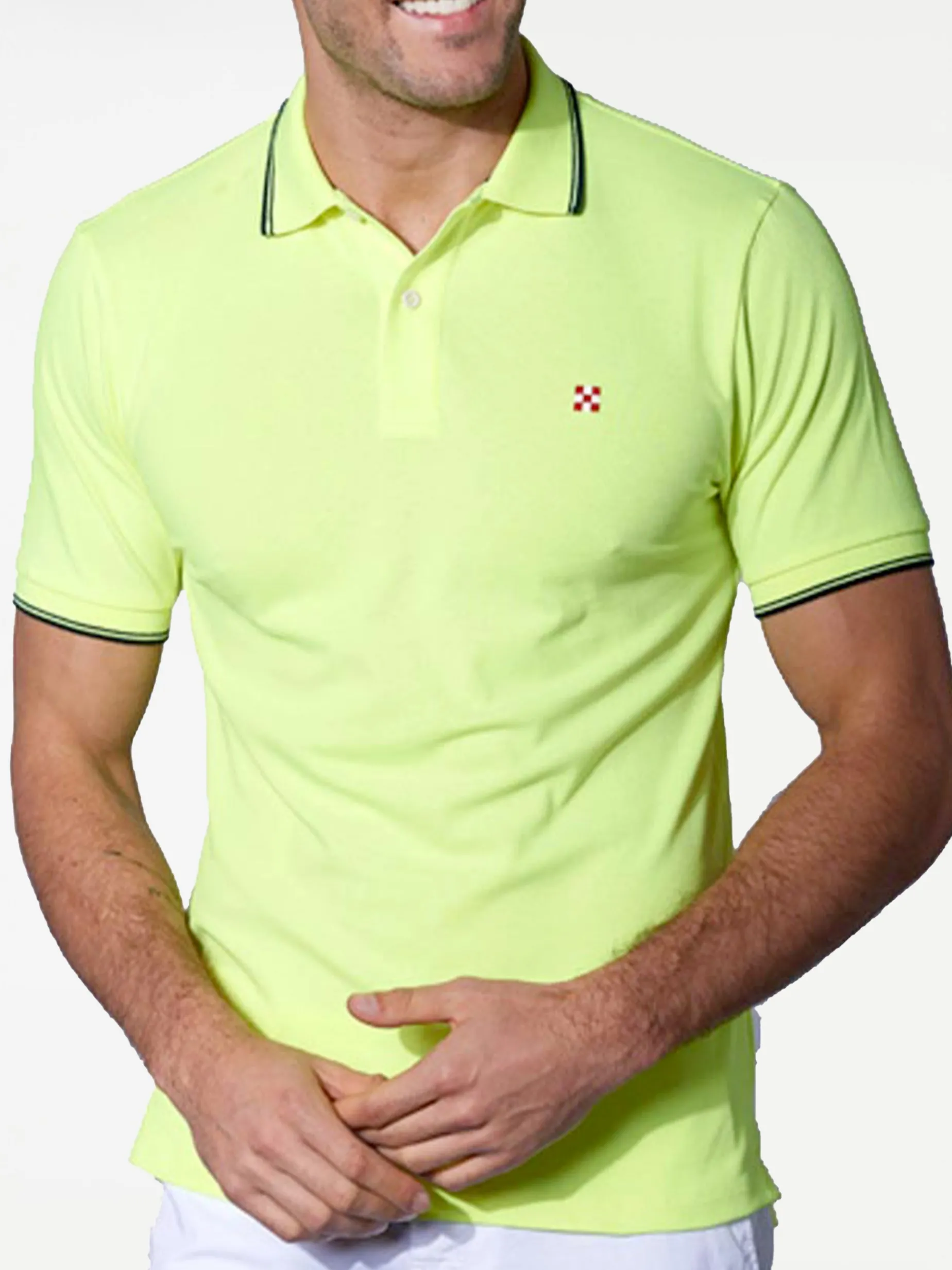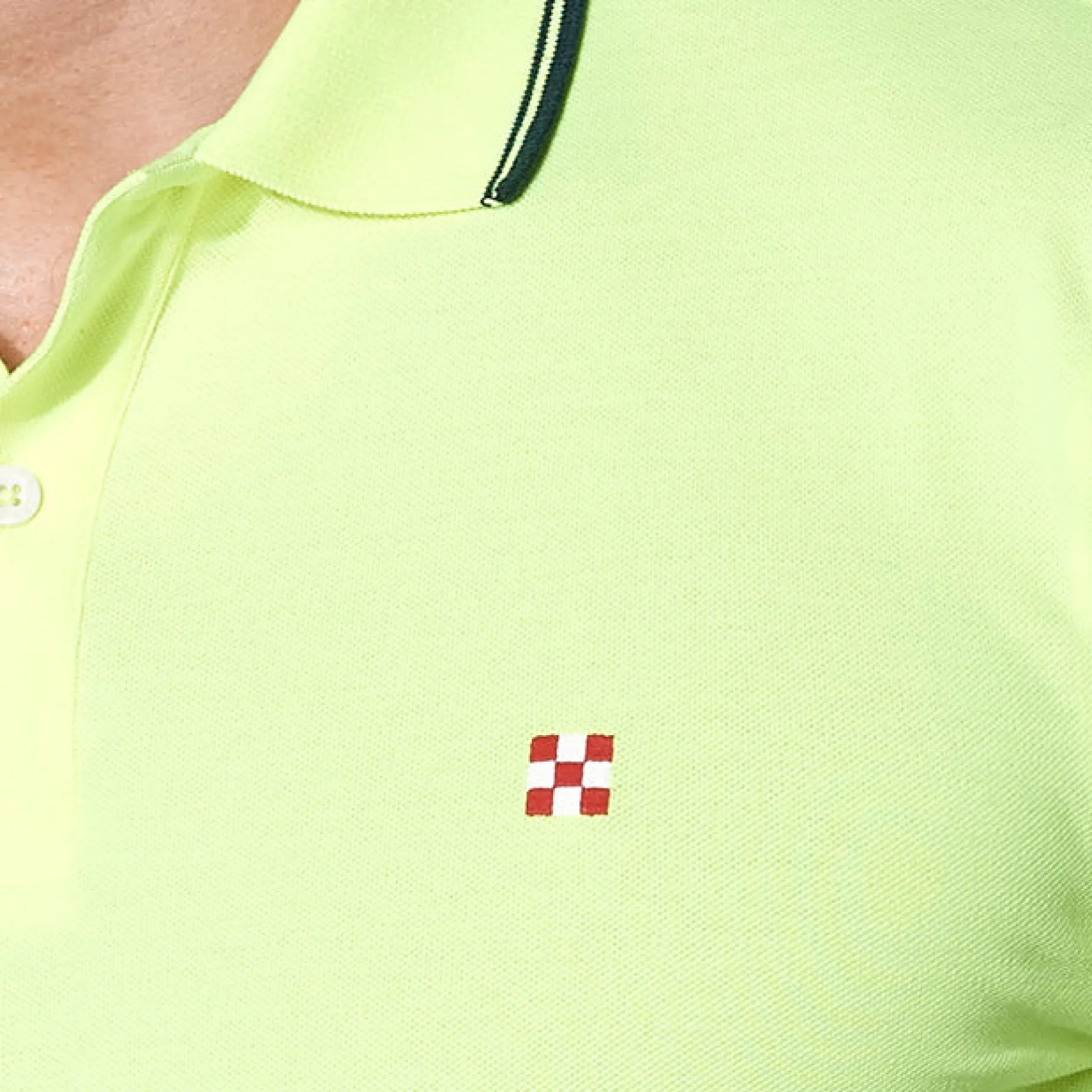 polo in piquet di cotone giallo fluo, piccolo logo a quadri rosso e bianco ricamato sul davanti, grafica St. Barth sul collo, dettaglio etichetta interna fluo, vestibilità regolare, maniche corte, stile St. Barth! Composizione: cotone 100%.