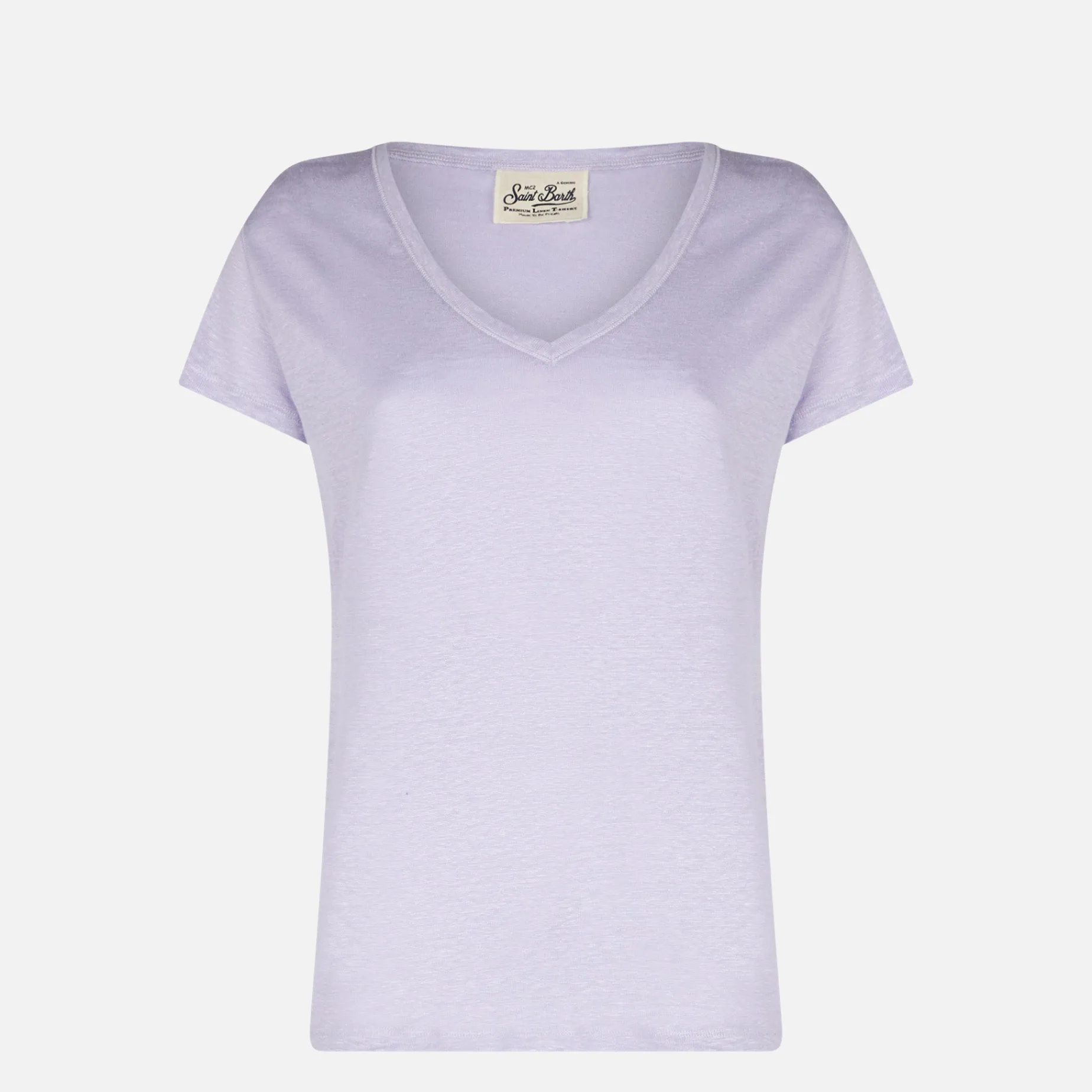 morbido jersey di lino lilla, manica corta plissettata, modello St. Barth. Composizione 100% Jersey di Lino.
