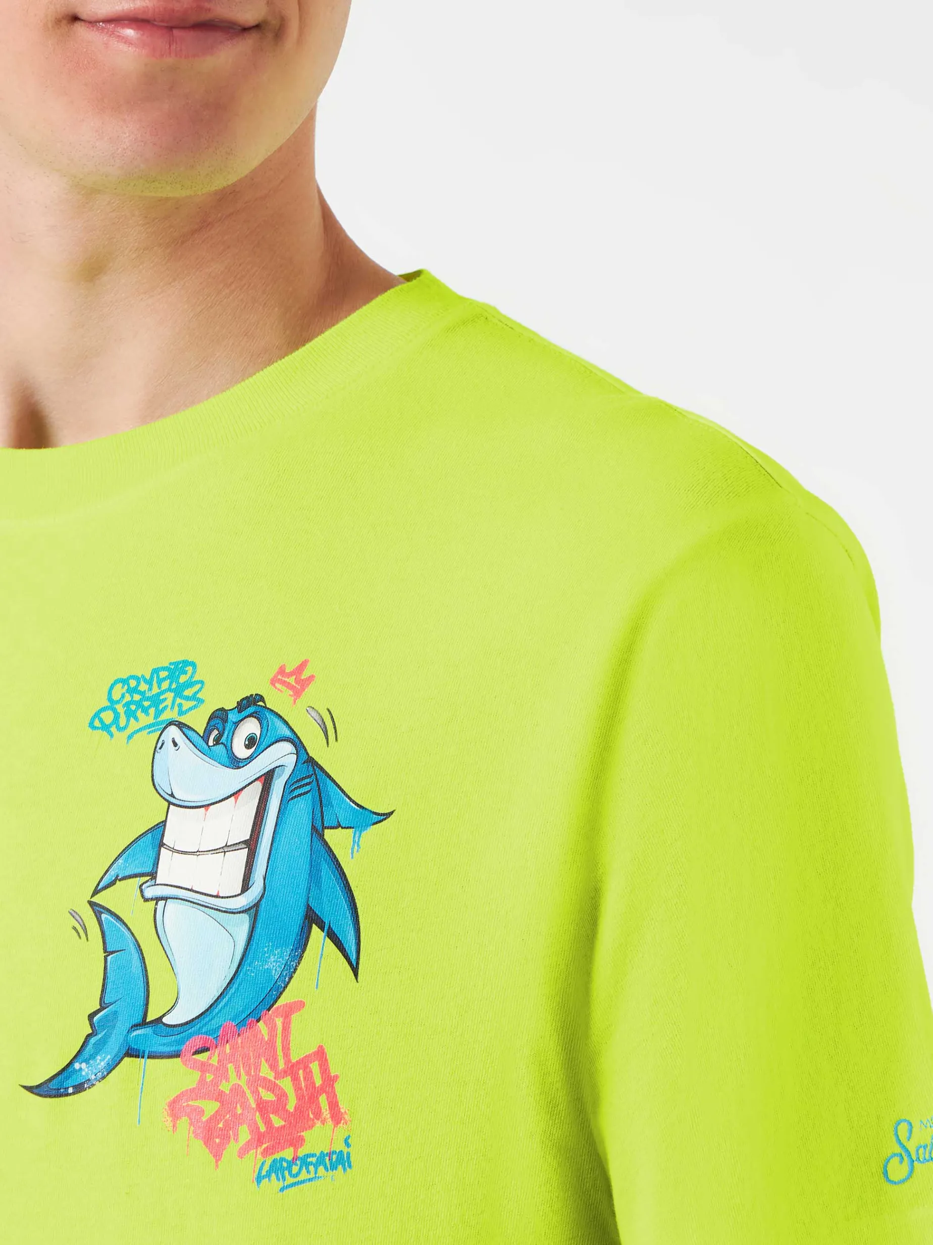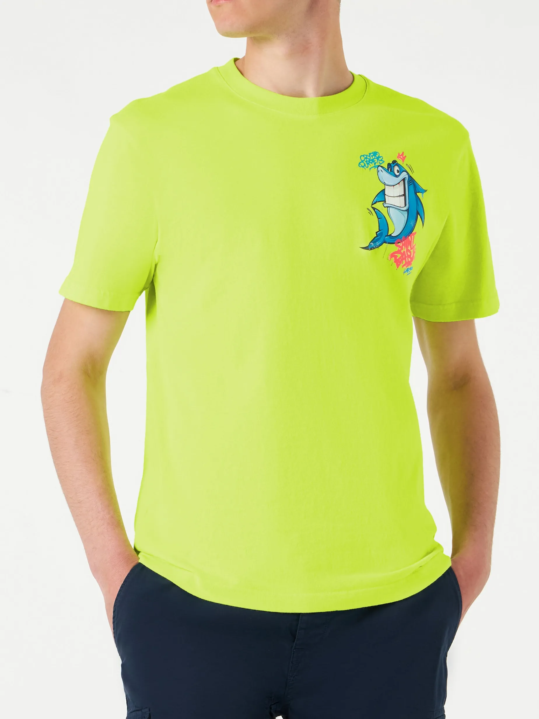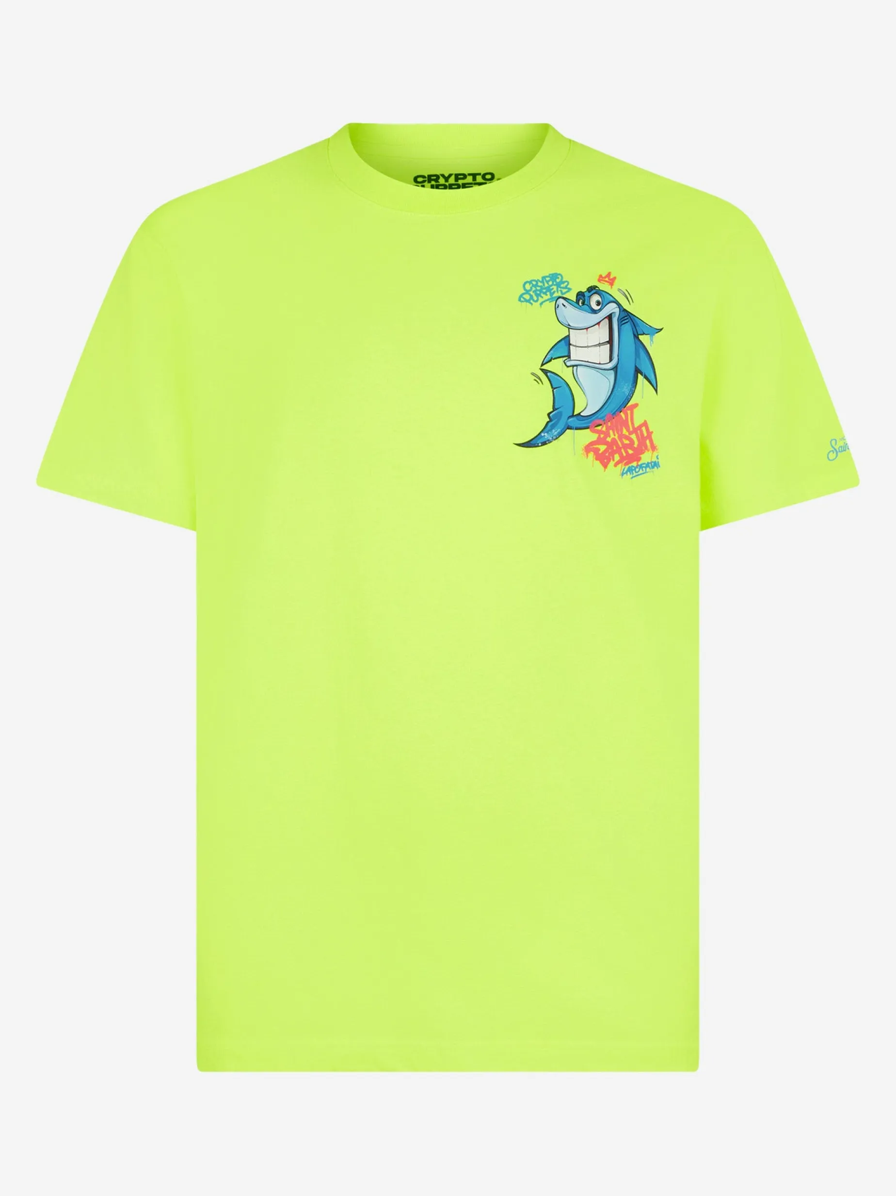 Stampa squalo fronte e retro su sfondo giallo fluo