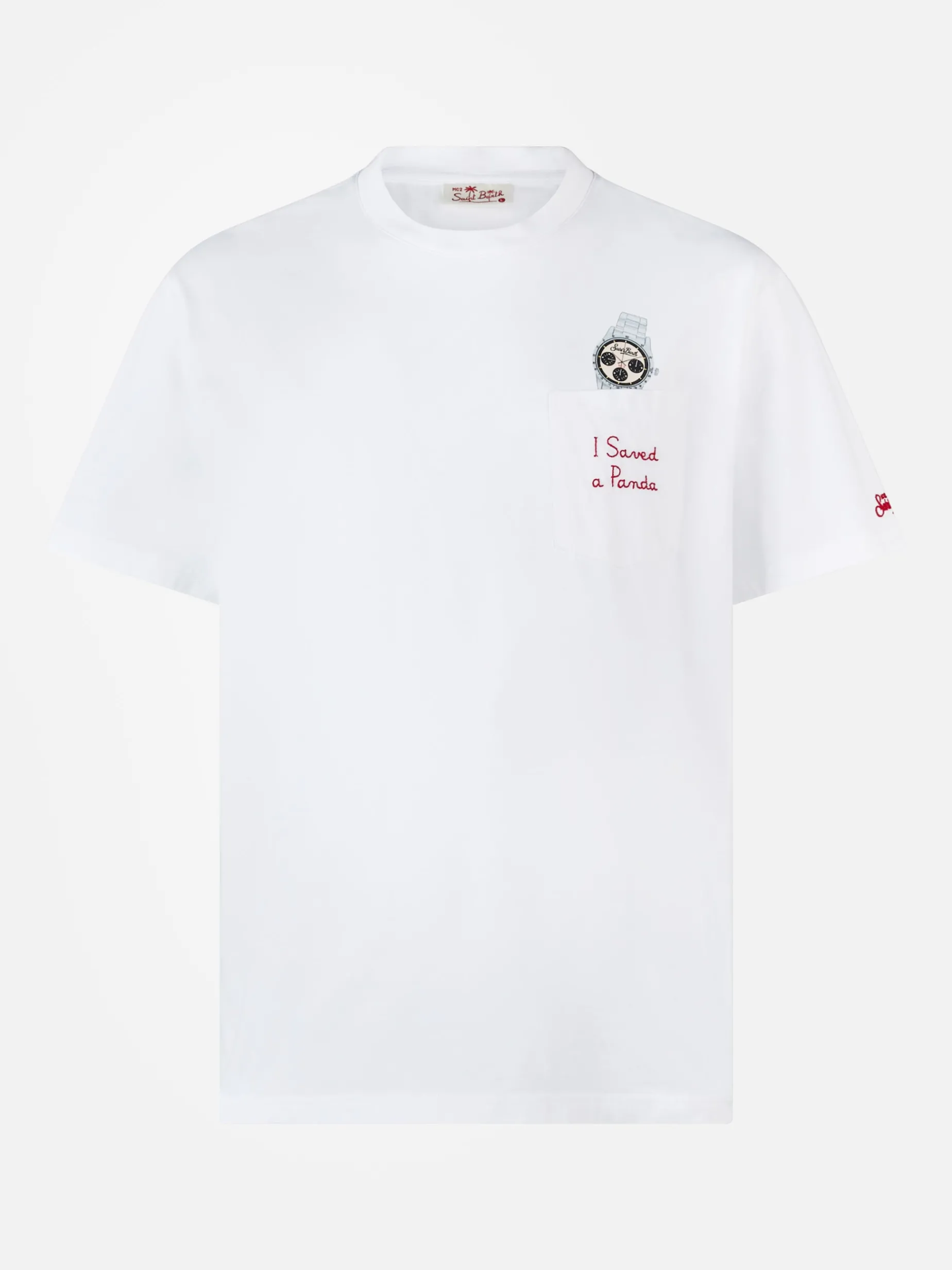 Tasca applicata sul petto sinistro con ricamo “I saved a Panda” e stampa dell’orologio