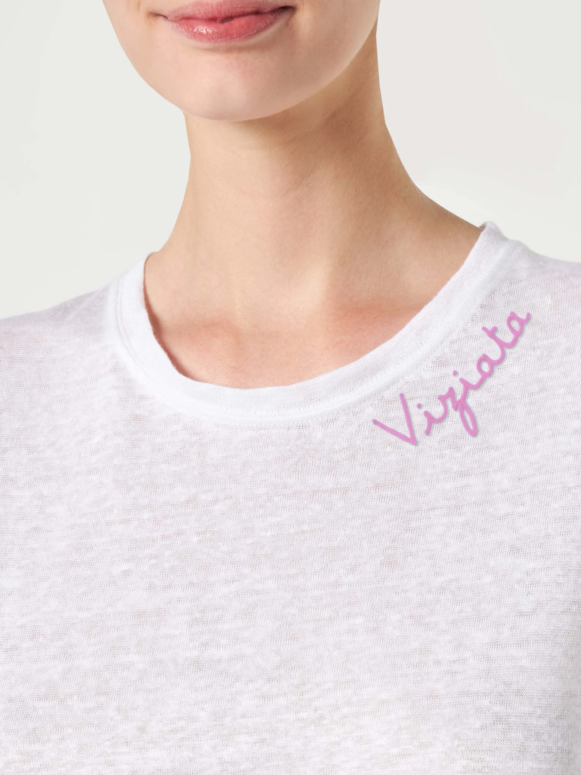 morbido lino, maniche corte pieghettate, stile St. Barth. Composizione 100% jersey di lino.